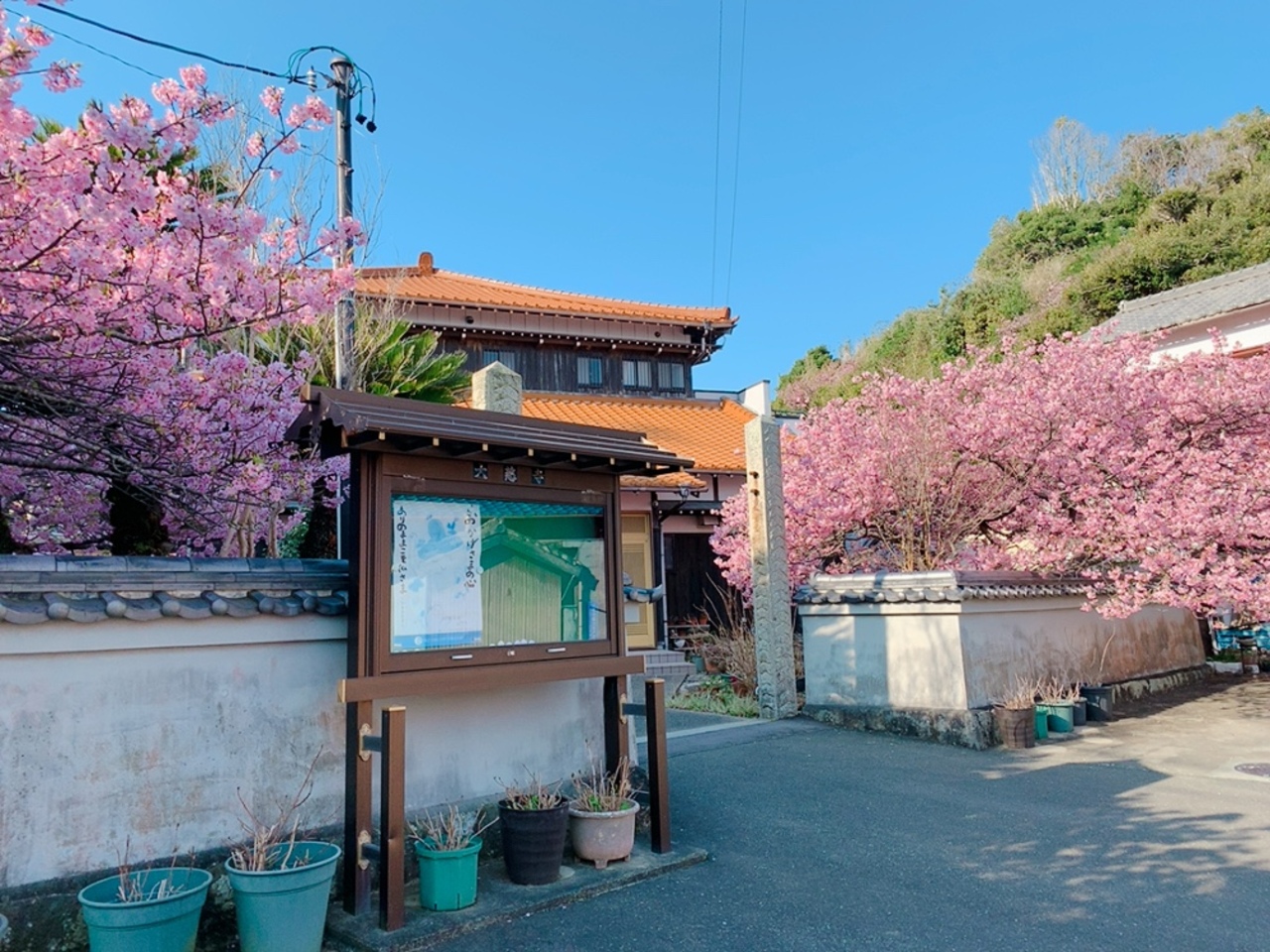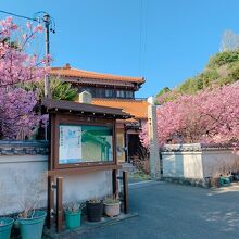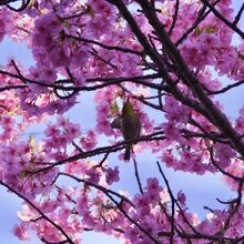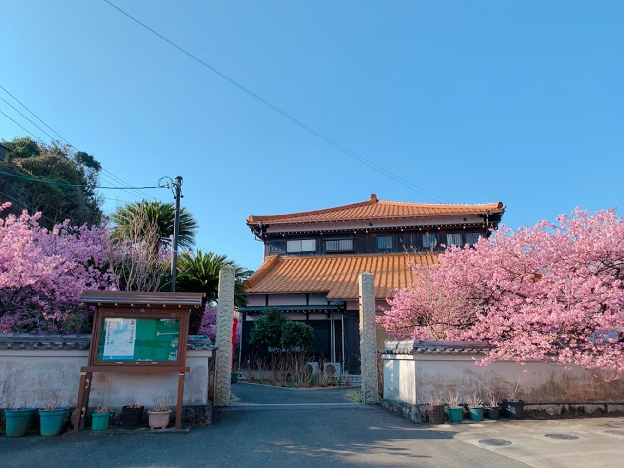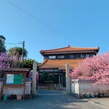 建物の外観は、あまりお寺っぽくはナイですが、ローカル新聞の記事通り、濃いピンク色の河津桜がめちゃくちゃキレイに咲いてます! 敷地を囲むように、たくさんの河津桜の木が植えられているようです。 ソメイヨシノとはまた違う魅力の河津桜。 青空に濃いピンク色が映えます! 晴れてる日なら尚更、青空とのコントラストを楽しめると思います。 朝早かったからなのか、たくさんのメジロが桜の木の周りを飛んでて、かわいく鳴いてて、写真撮ろうと頑張りましたが、動きがすばしっこくてなかなか撮影は難しかったです。