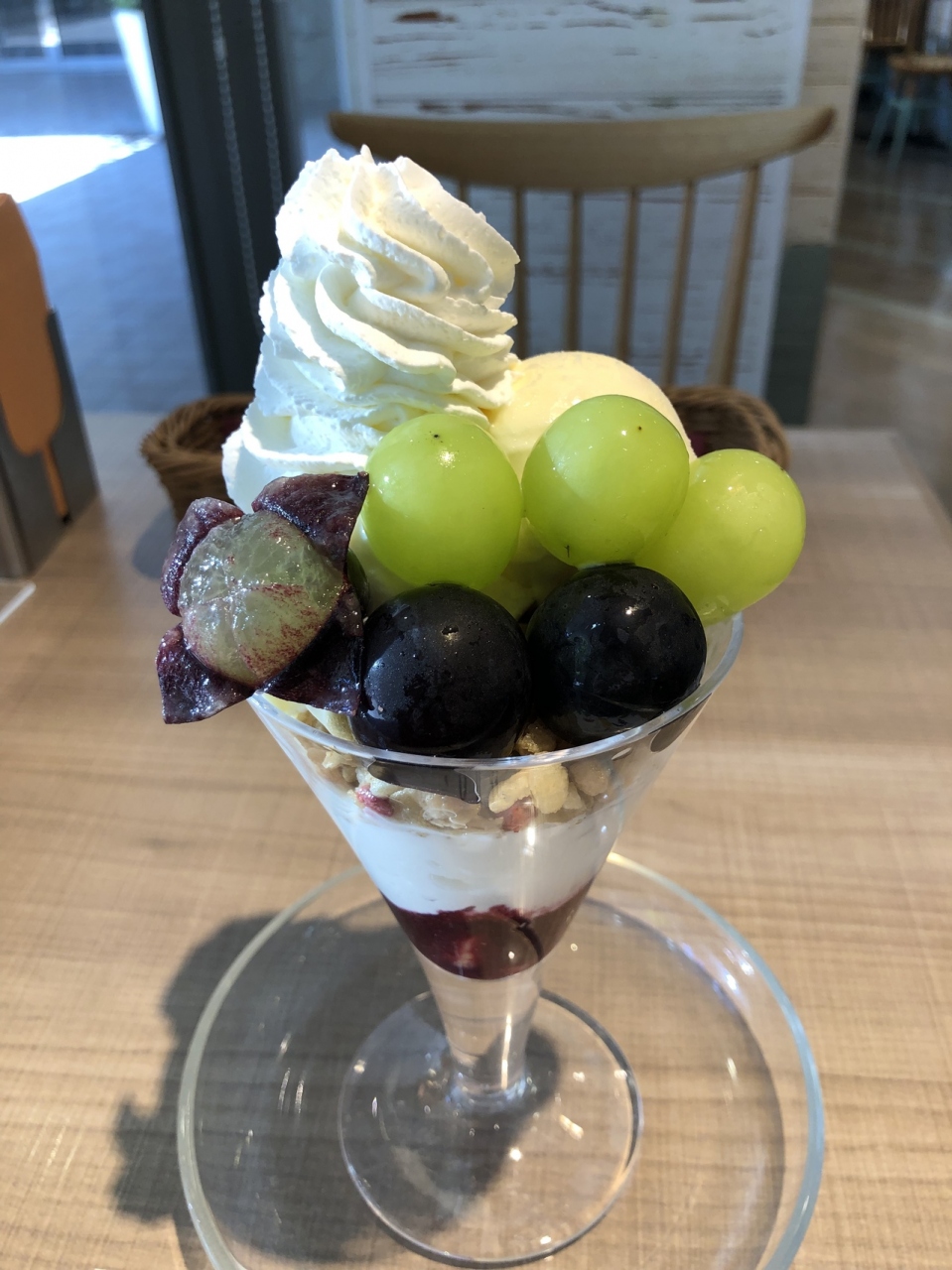 今回は限定のブドウのパフェをいただきました。メニューにのってなかったので、内容をきくと、男性の店員さんが丁寧に、わざわざ、奥からこの入れ物に入るのですが、と、空のパフェ皿までだしてきてくれて、説明してくれ、感動しました。