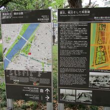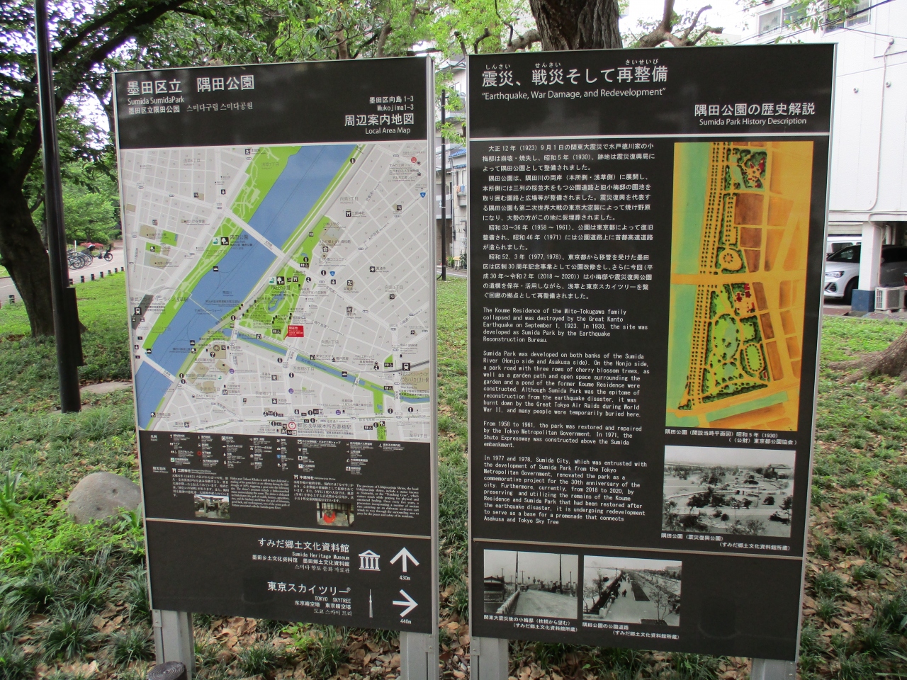 隅田川の吾妻橋と言問橋の間、両岸にある公園です。特に墨田区役所側の公園入口にある門柱は、上部の照明器具がレトロでした。のんびりと散歩や休憩にをとったりするには、最適の公園でした。また回遊式の日本庭園などもあって、市民の憩いの場になっていました。