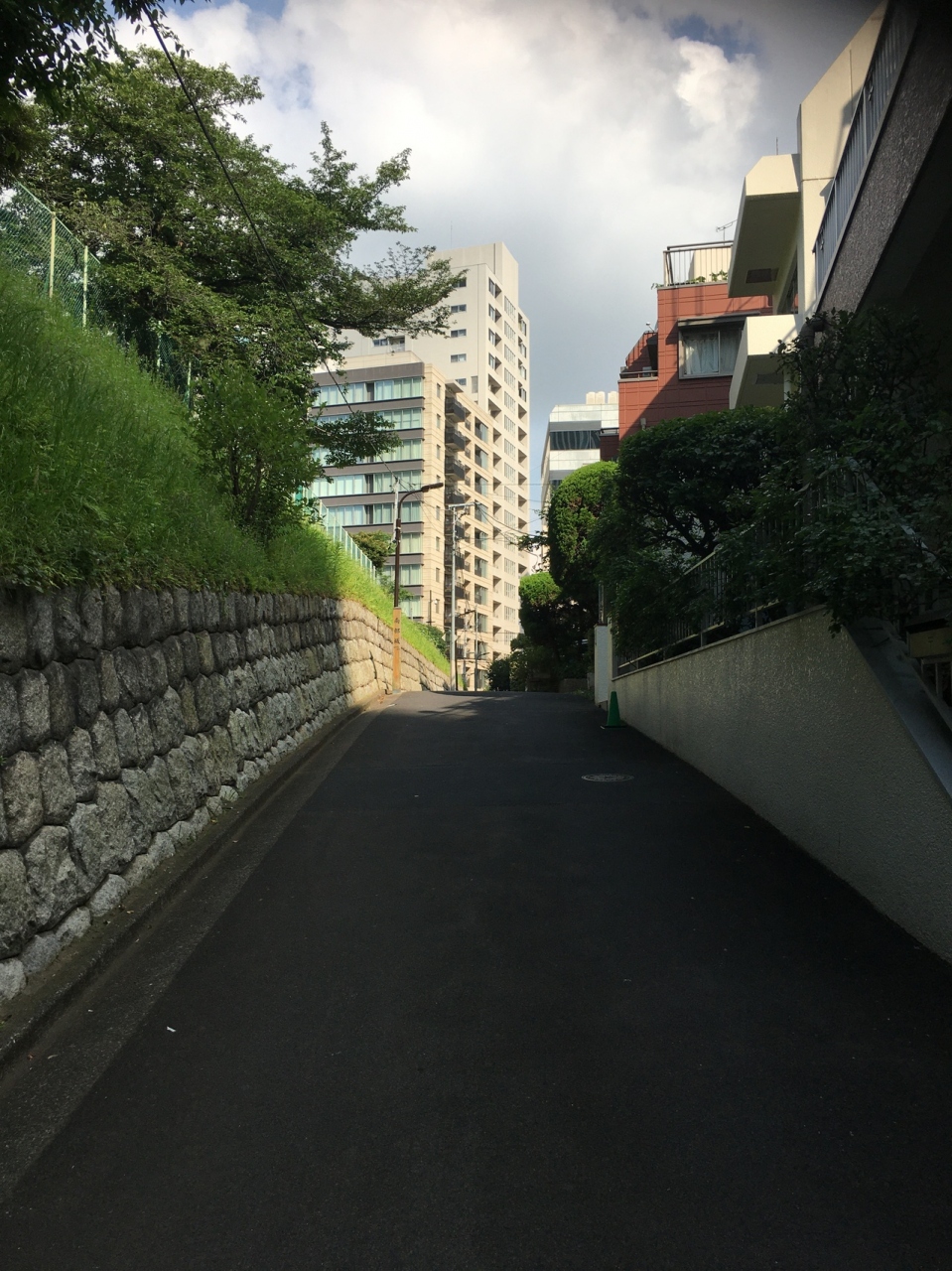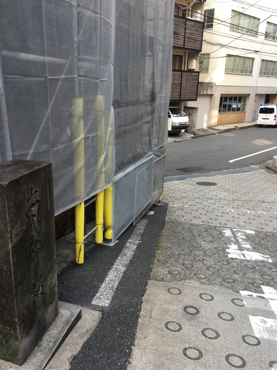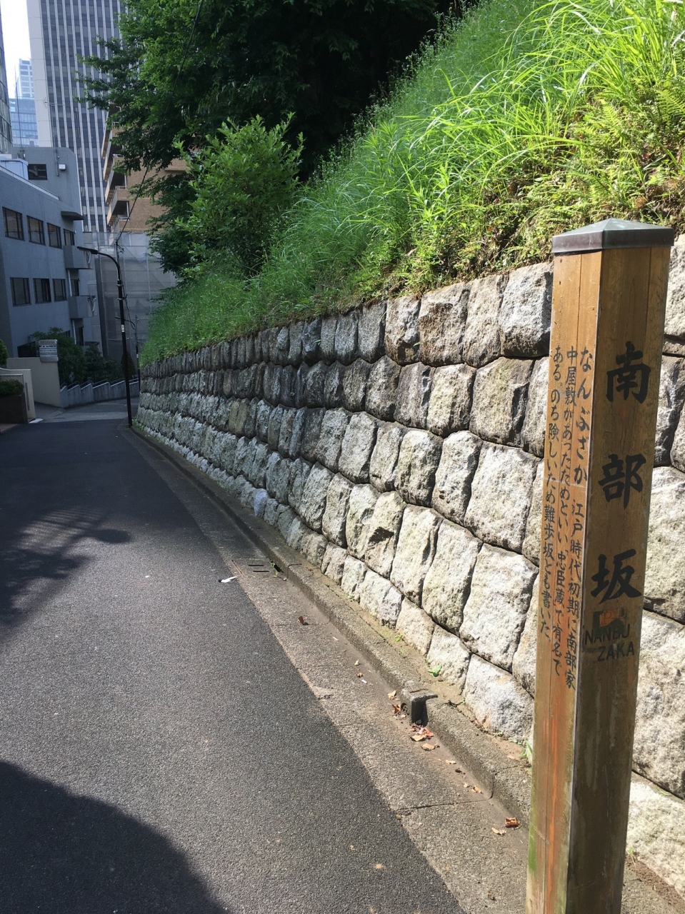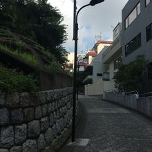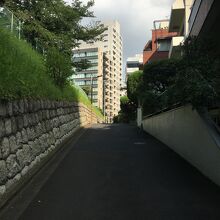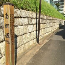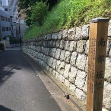 下から登ると右側には古い石碑があり年季が入っていました。一方通行の坂で、道沿いには低めのマンションが目立って建っていてカーブになっていました。上に上がると木の碑がありました。江戸時代、難波家の屋敷があったのでこの名称です。