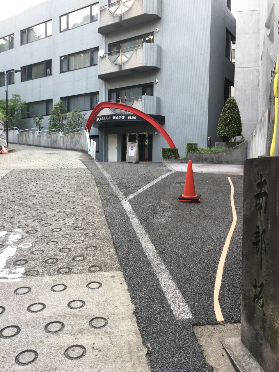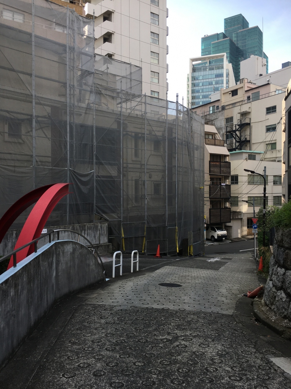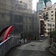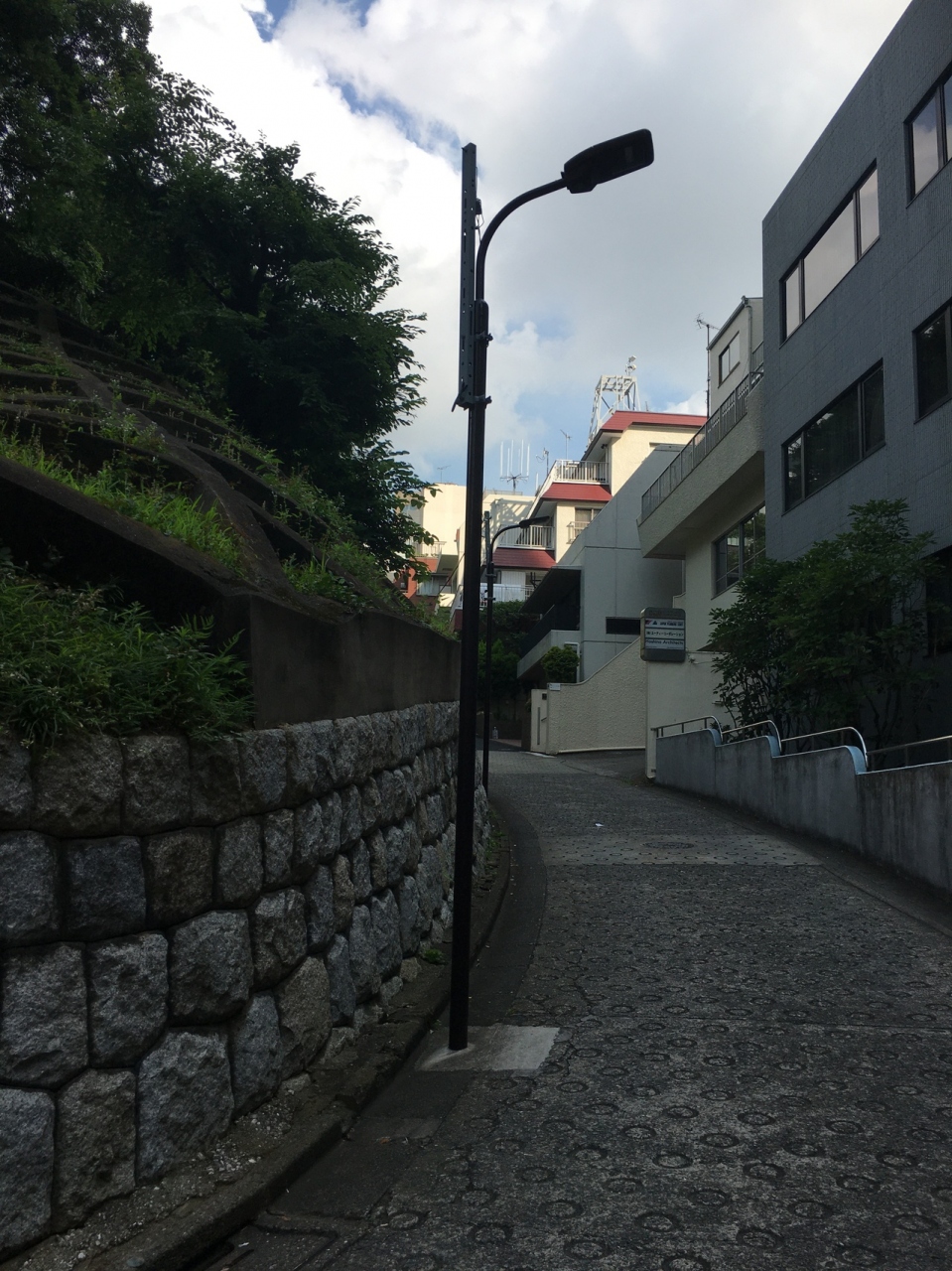 下から登ると右側には古い石碑があり年季が入っていました。一方通行の坂で、道沿いには低めのマンションが目立って建っていてカーブになっていました。上に上がると木の碑がありました。江戸時代、難波家の屋敷があったのでこの名称です。