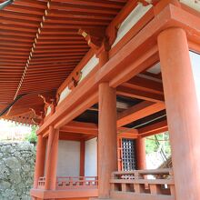 吉備津神社の本殿脇から続く廻廊の途中に南随神門があります。本瓦葺、入母屋造りの八脚門で1357年に建てられた門で、吉備津神社の建物では最古のものです。廻廊の途中にあるために、前だけをみていると廻廊の一部の様に見え、門だと気付かない人も。