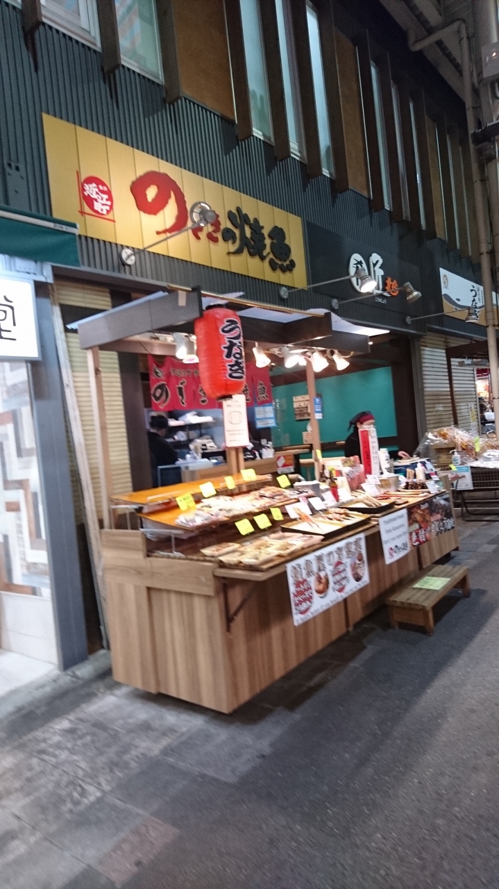 石川県の中心都市、金沢にある近江町市場のなかにありました。近江町市場では新鮮な魚や野菜、フルーツ、スイーツなどいろいろ楽しめるスポットです。のざきの焼魚さんではえびやうなぎ、どじょう串をつまみに地酒のワンカップで立呑は最高でした