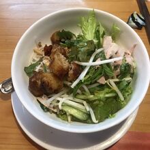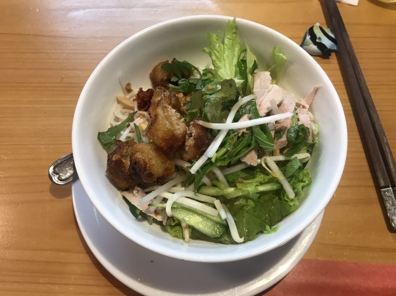 ベトナム料理店ではいつもフォーばかり食べている気がするので、今回はブンチャーをいただきました。これも米の麺を使った料理ですが、ツユは底に溜まっているだけで、沢山の野菜や豚肉とともにいただきます。フォーより刺激的な味がたまらなくいいです。デザートも付いてきて、大満足でした。