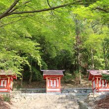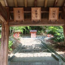 吉備津神社の本殿脇から廻廊を下り御釜殿の分岐を越えた先、左手に朱色の3つの社が立つ場所があります。そこが三社宮です。左から春日宮、大神宮、八幡宮をそれぞれ祀っており、一度に3つの神様にお参りすることが出来ます。しかし、観光客は誰も居ません。