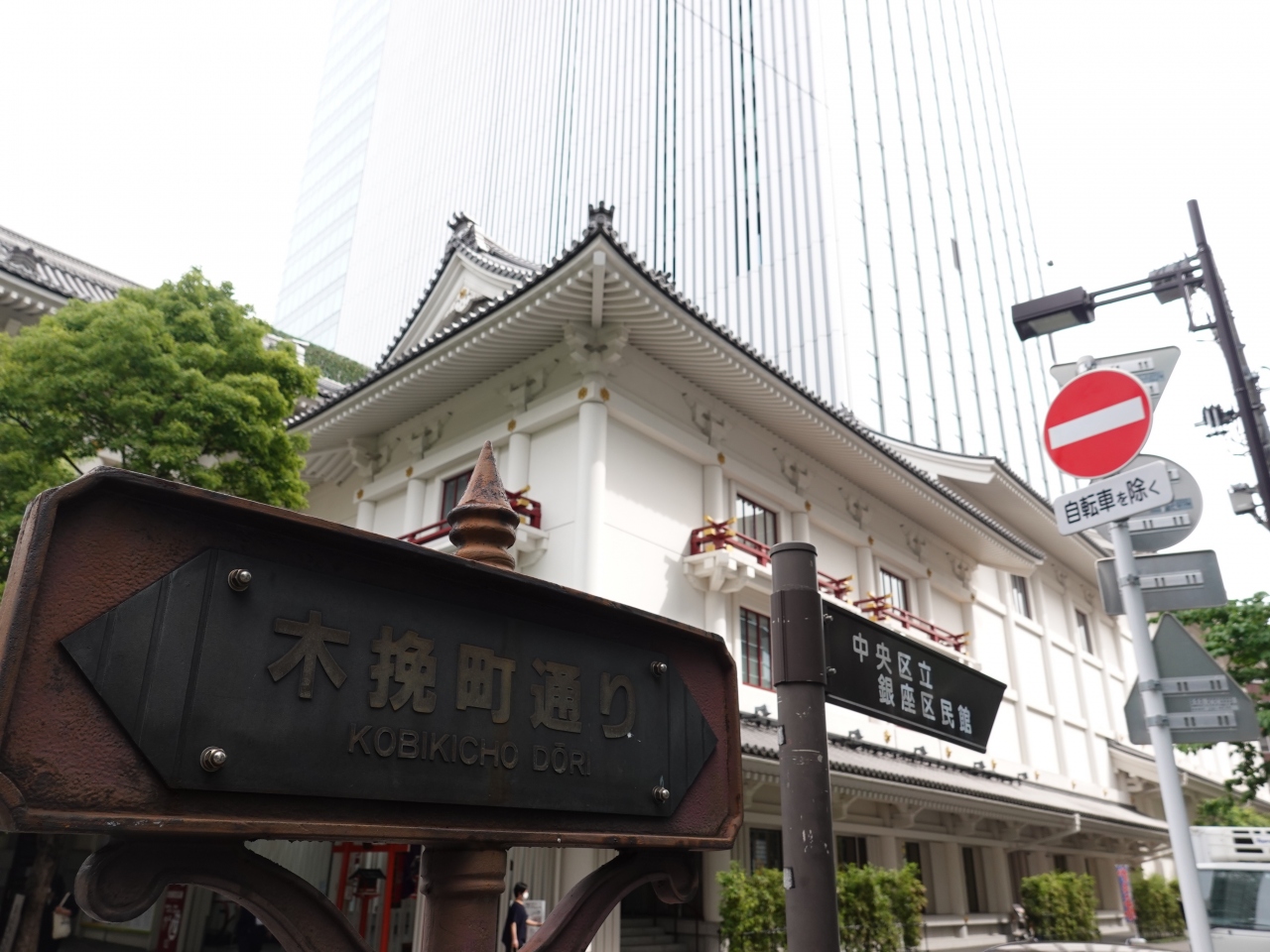 「木挽町」という名前の語源は、江戸時代に江戸城大修理の工事に従う木挽職人を多く住まわせたのが由来ということです。晴海通りと交わる箇所では背後に歌舞伎座の姿があります。北上していくと徐々に銀座の喧騒とは縁がなくなり、ところどころに昔ながらのお店などが点在する味わい深い光景が見られます。