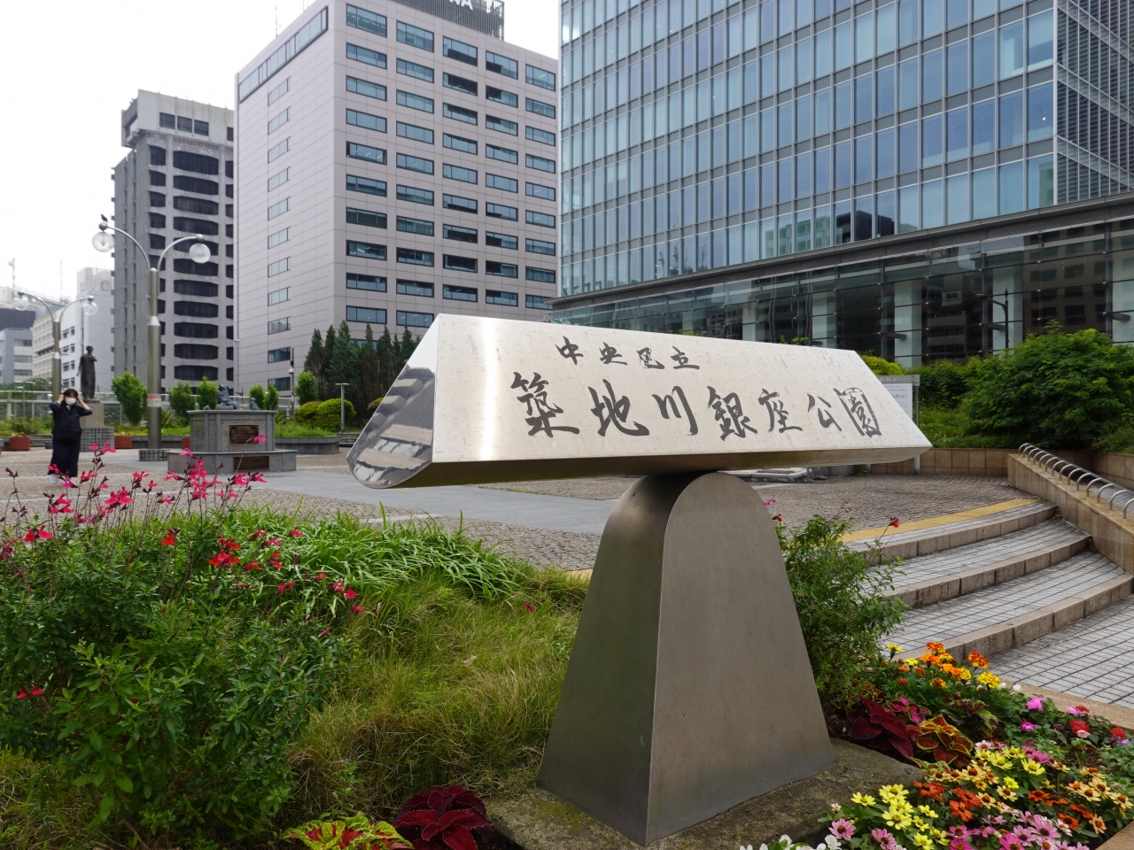 「築地川銀座公園」は、 晴海通りが首都高速都心環状線と交差する部分に架かる橋、万年橋の両側に広がる都心の公園です。緑豊かな季節で花壇には色とりどりの花も見られ、とても鮮やかでした。ガイドブックなどでもしばしば紹介される「名犬チロリ記念碑」があることでも知られています。