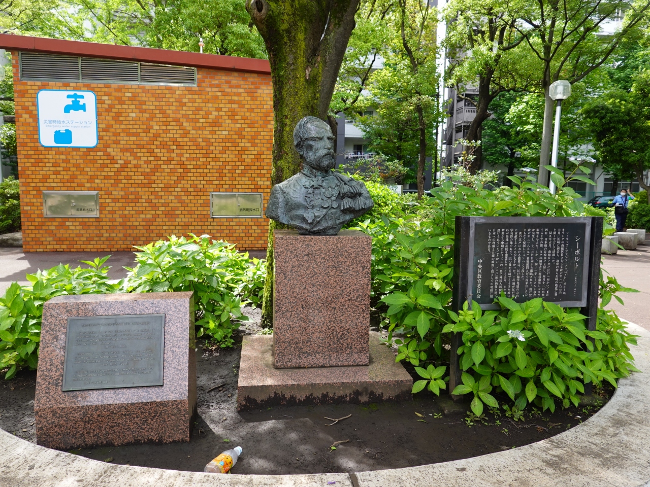 聖路加タワーの近くにある「あかつき公園」は、近隣の子どもたちの良い遊び場であるとともに、緑が多く、モニュメントや史跡も点在しています。そんな「あかつき公園」の中で、特に印象に残ったのが「シーボルト像」です。公園のもっとも東側に位置し、胸像とともに銘板、案内板が設置されています。髭をたくわえた凛々しい表情が素晴らしいです。