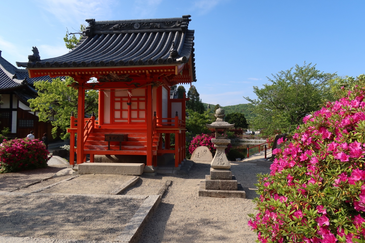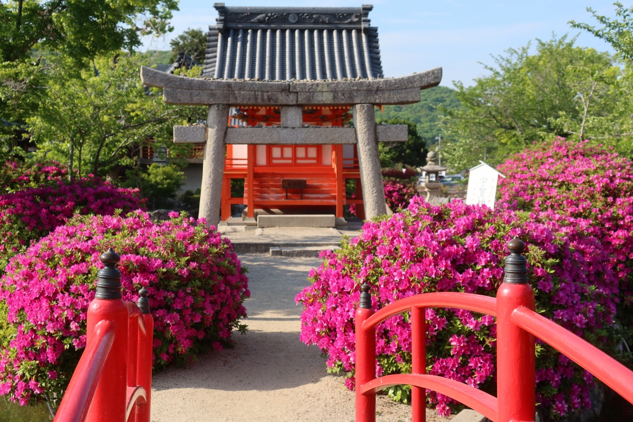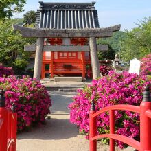 吉備津神社の御釜殿の道を挟んで西側にある池の中に中島が浮かびます。その上に建つ祠が宇賀神社です。五穀豊穣をもたらす神様です。摂社のなかで何故離れた所にあるのは分かりませんが、訪れた時期は宇賀神社の周りにつつじの花が沢山咲いており印象に残る神社でした。