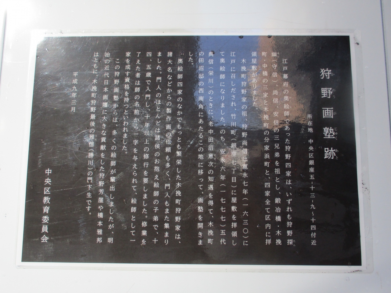 昭和通り沿い、みゆき通りと交差するあたりに説明板があります。が、訪れた時はその場所が工事中で白いフェンスがありました。そのフェンスに説明板のコピーのようなものが貼られていました。びっくりしました。こちらは江戸幕府の奥絵師四家の中でもっとも繁栄した狩野家の画塾があった場所です。当時の面影はなにもありませんでした。