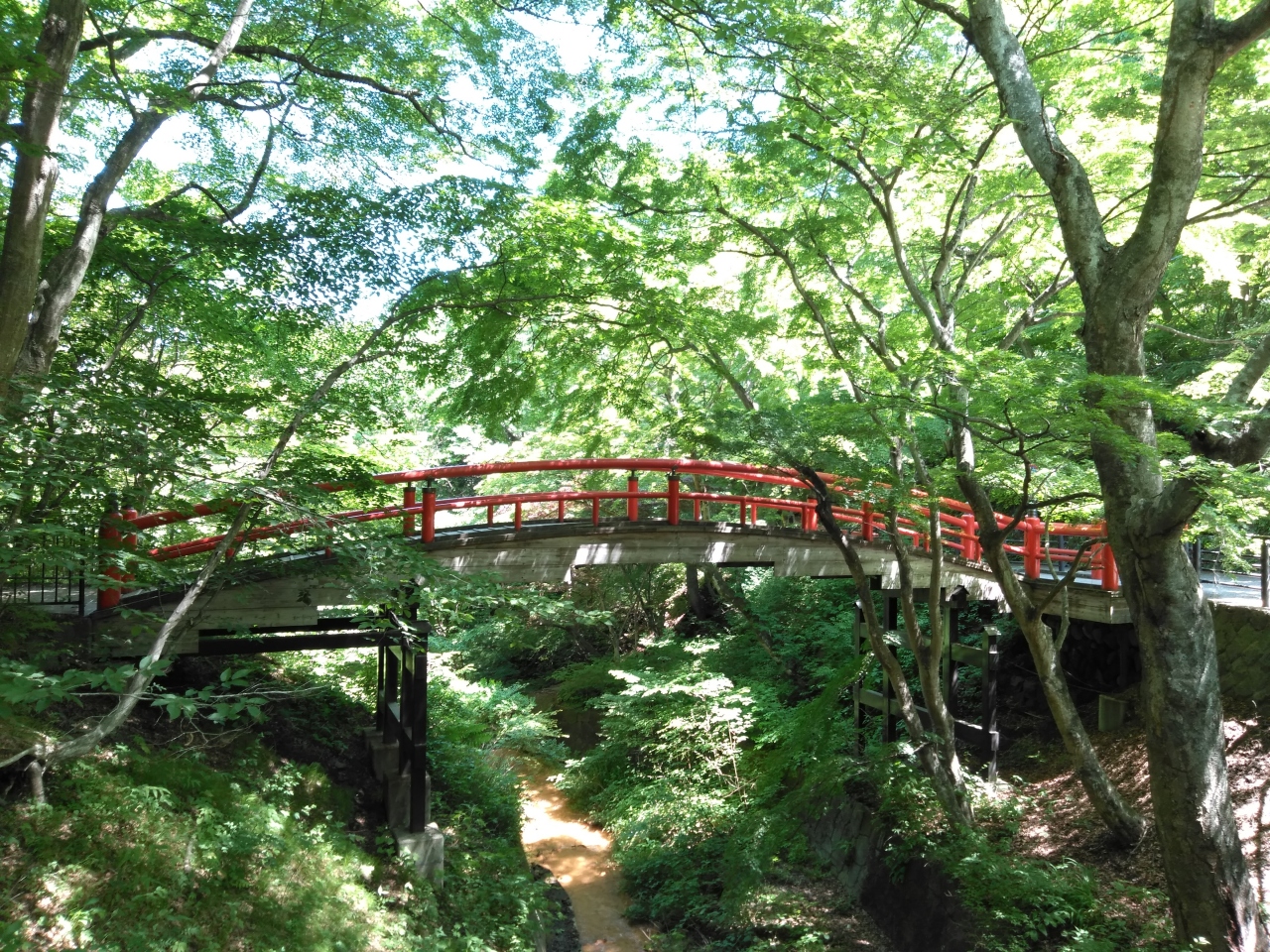 紅葉時も綺麗ですが、赤い橋が新緑に映えて綺麗でした。下に見える川底の色もみものです。すぐ近くに無料の駐車場があります。奥には飲泉所、露天風呂、噴出口もあったり、伊香保神社へも行けるので、一緒に散策するのがお勧めです。
