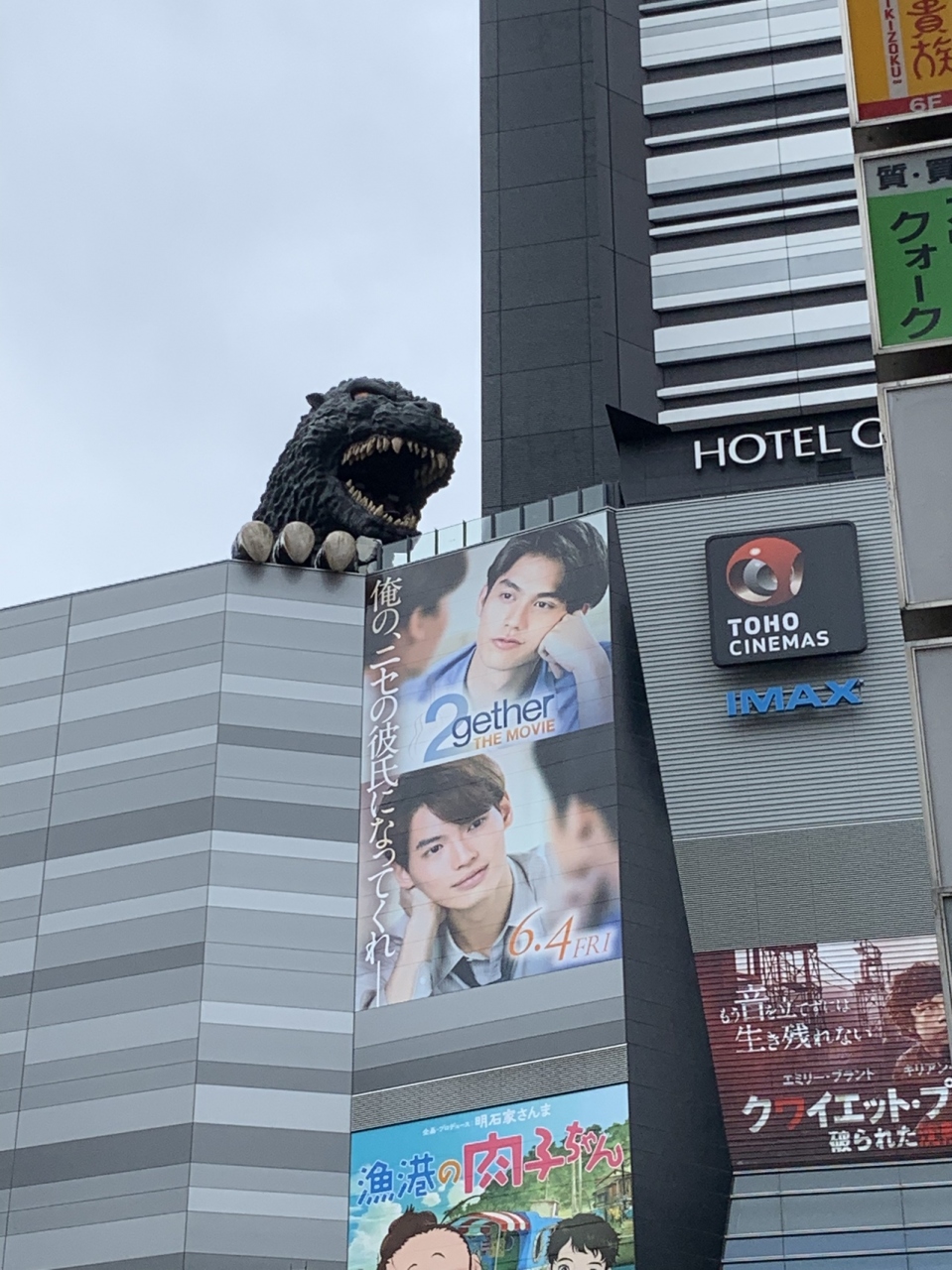 終わって駅方面に歩いていて、ふと振り返ると、屋上に「ゴジラ」がいました。