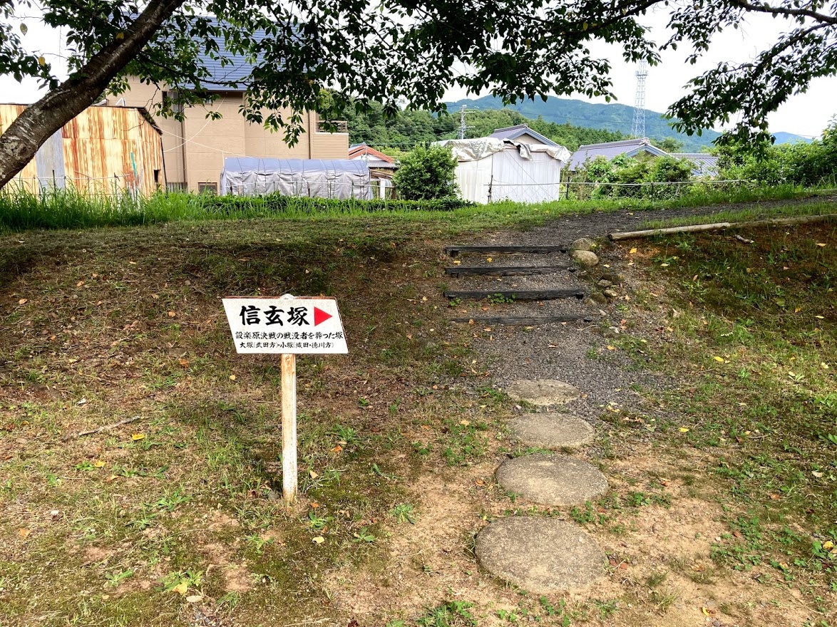 武田は勝頼のはずですが、信玄は武田軍の代名詞的に使われていたので、武田軍の塚を信玄塚と呼んだようです。