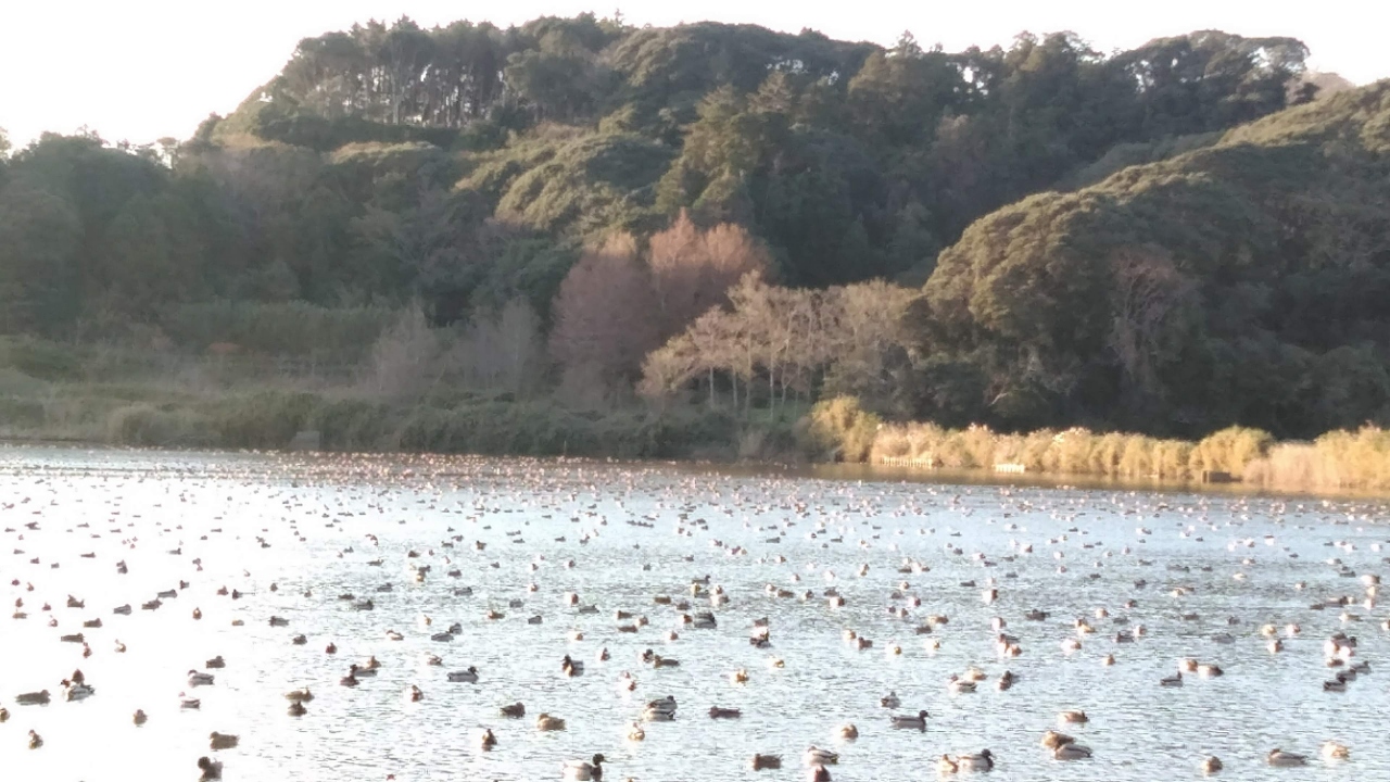 それから「夏目の堰(八丁堰)」に行って、日が「八万石見晴し台」の方に沈んでいくのを眺めると、沼面に浮かぶ無数の水鳥たちが光っていました。