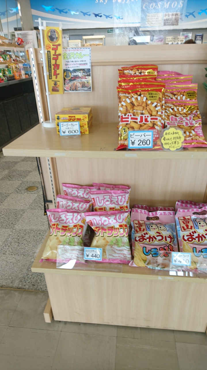石川県の金沢や加賀温泉を観光するために飛行機を利用しました。発着は小松空港で、空港内にあるショップです。コンビニのようにドリンクやコーヒーのほか、お土産もあります。金沢近辺では人気のビーバーが購入できます。サクサクした食感がおいしかったです。