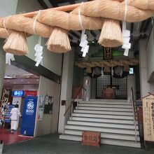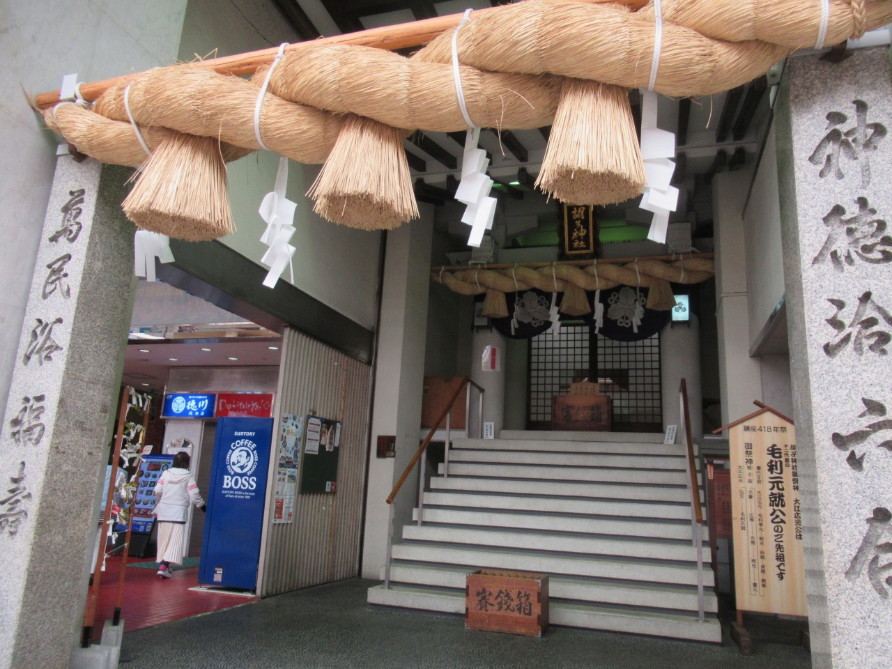広島三越の裏手、えびす通り商店街のアーケードを歩いていたら、見つけました。大きな綱が目に付き、参拝している人を見かけたので、立ち寄ってみました。綱と賽銭箱は神社らしい風情がありましたが、商業ビルの入口のような本殿など、はたしてここは本物の神社なのか、と疑ってしまうほどでした。
