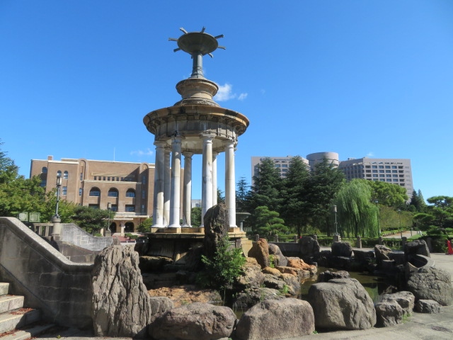 明治43年に鶴舞公園を、会場として第10回関西府県連合共進会が開かれ、会場の正面を飾ったのがこちらの噴水塔です。ローマ様式の大理石柱に岩組という和洋折衷様式で、ここだけヨーロッパの雰囲気が流れています。前が池のようになっていて、夏は涼しい感じです。