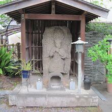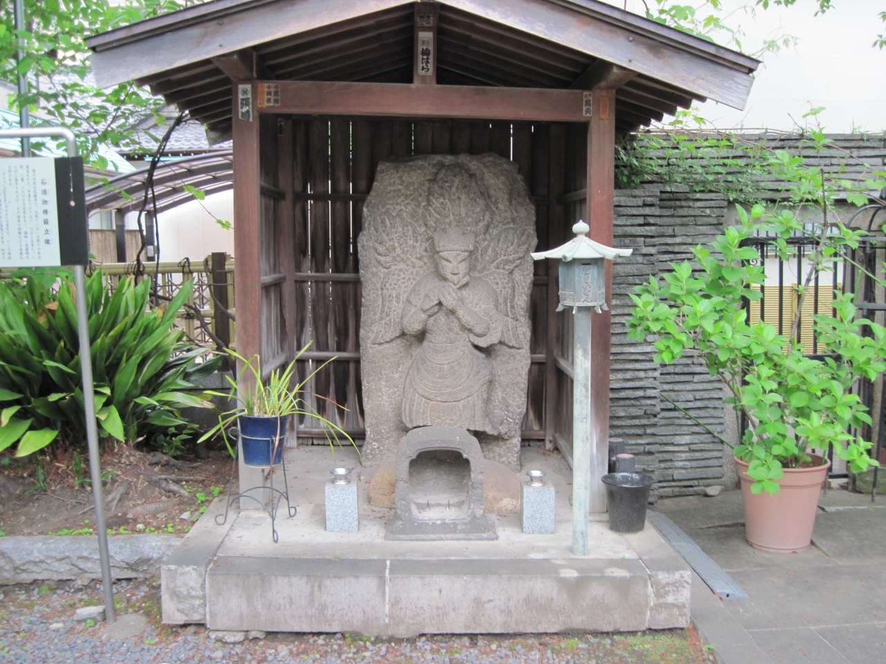 江東区の清澄近辺を散歩していて、本誓寺というお寺の境内に、不思議な姿の石像がありました。背中には羽があって、お顔は口ばしがあります。そして横笛らしきものを吹いています。普通の仏像とは全くお姿が異なる石像でした。