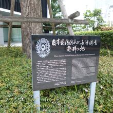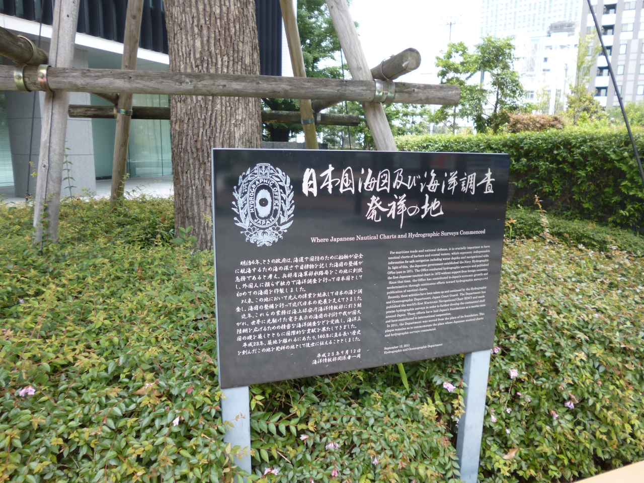築地の中央市場通り沿い、東京国税局前の植え込みに「日本国海図及び海洋調査発祥の地」の案内板があります。平成23年に設置された比較的新しい案内板で、漆黒の板に白い文字が刻まれています。有志で設置したものなのか、日付の下に「海洋情報部関係者一同」と記述があるのが興味深いです。