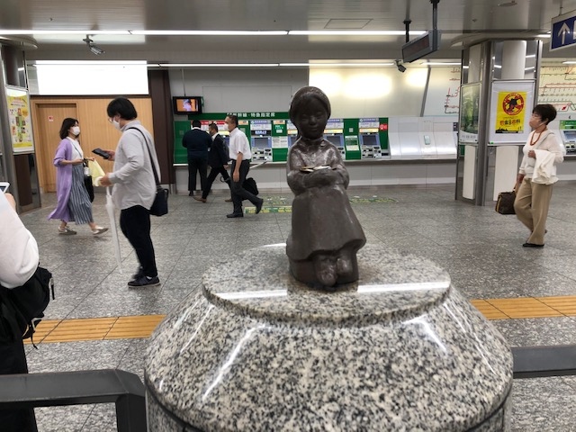 JR横浜駅の中央通路にある像で、よく待ち合わせ場所に使われています。大理石の台座の上に30センチほどの大きさが乗っています。山下公園に赤い靴はいてた女の子像(座って海を見つめている姿)がありますが、この像のミニチュア版として作られたものです。像の下の台座には、童謡「赤い靴」の4番までの歌詞と、「赤い靴はいてた女の子」の解説が、金色のプレートに刻まれています。