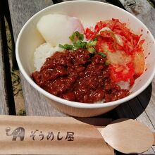 やばい、これ絶対うまいヤツやん。食べる前からわかっていましたが、やっぱりうまいです。元々「野田商店」という味噌屋が始めた店なので、自慢は肉みそ。甘辛い味がしっかりとある優しい味わいの肉みそと白ごはんとの相性はばっちり。これだけでも何杯もごはんが食べられそう。そしてキムチと半熟卵。パーフェクトです。