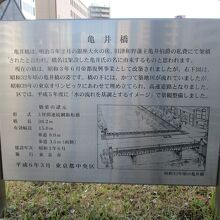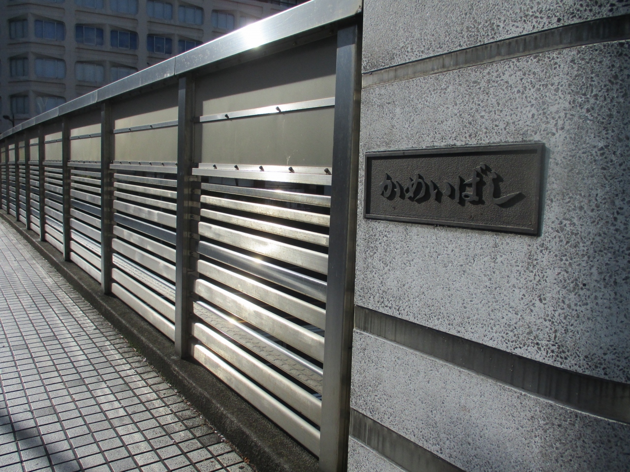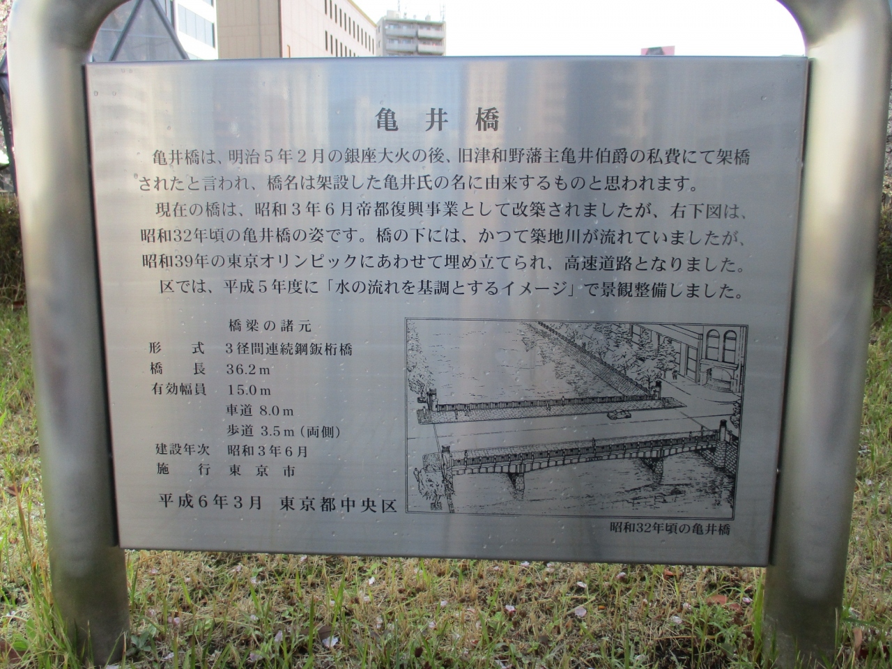 もと築地川、現在の首都高速の上にかかる橋です。亀井橋の名前の由来は、亀井伯爵という方が橋を作ったことによるそうです。橋はすぐに渡れる短いものです。このあたりは橋がとても多いです。隣に公園が併設されています。