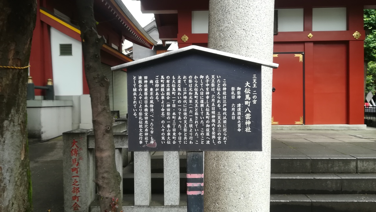 こに神社は江戸時代以前に祀られていたと伝えられています。左手に小舟町八雲神社、そして、右手に大伝馬町八雲神社が祀られています。三天王の二の宮の天王祭は、六月五日ですが、べったら市も同時開催されますので、べったら漬けが好きでしたお勧めですね。