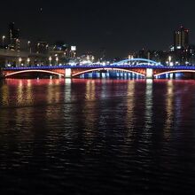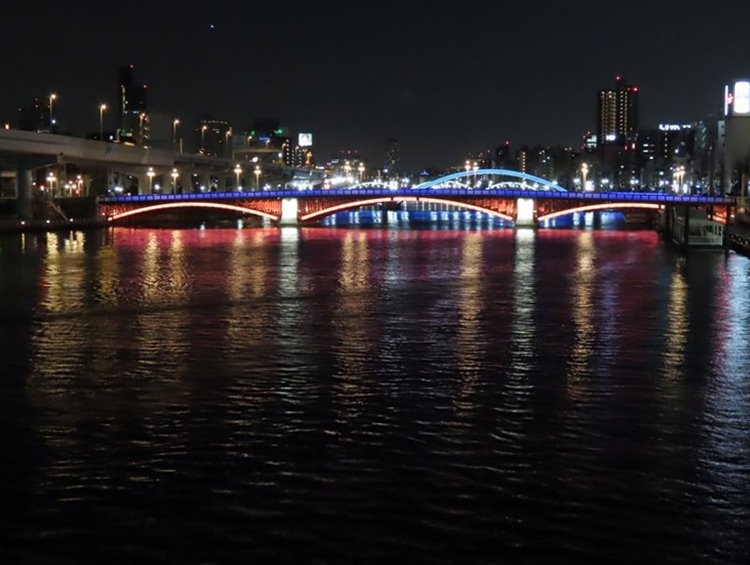 隅田川にかかる東武浅草線の鉄橋に沿っているリバーウォークから、すぐ隣のライトアップされた吾妻橋を眺めてみました。アーチに沿って意図的にデザインされていて、赤や青の光が夜の川面に映ってなかなかカラフルでした。