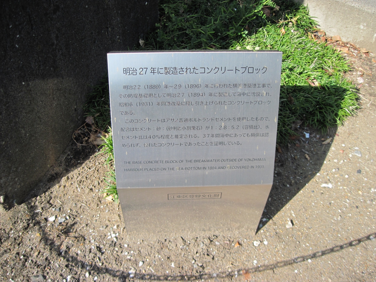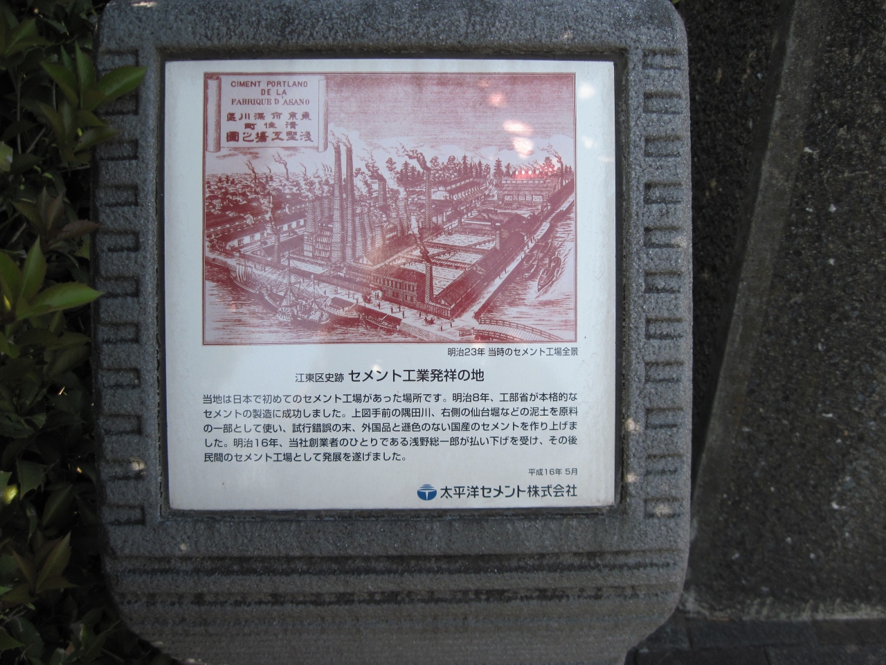 清澄近辺を散歩していた時に、道路わきに銅像、石碑、コンクリートの塊があったので、興味を惹かれて立ち寄ってみました。セメント工業発祥の地で、現在もセメント会社の敷地になっていました。明治時代の横浜港で使われたセメントブロックが、引き上げられて展示されていて、セメント工業は近代国家発展に重要だったのだろうと思いました。