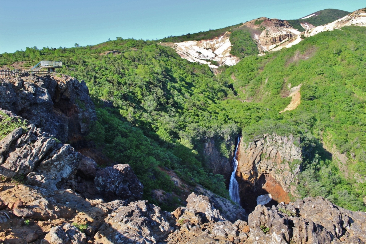 蔵王エコーラインにある断崖絶壁の展望スポットであり、駐車場から遊歩道を数分歩くと、断崖上に設けられた展望台に到着する。