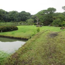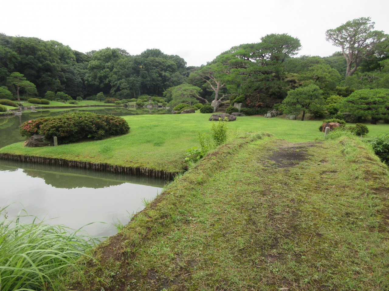 六義園の泉水沿いに造られた遊歩道と泉水に浮かぶ中の島を繋ぐ8mほどの橋です。中の島へは通行禁止になっているため、橋を渡ることはできません。橋に生えた芝やコケ、橋を渡った先にある手入れされた芝や緑深い木々など、何度訪れても渡ってみたくなりますが、残念ながら立ち入ることはできません。