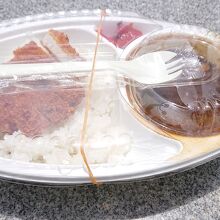昼食を求めて訪問しました。少し、辛い系の食べ物が食べたい気分でしたので、カツカレーを選択してテイクアウトしました。一つの容器の中に、カレー部分とライス部分が分かれている、という形での提供でした。カレー食べやすい程度の辛さで、おいしくいただけました。