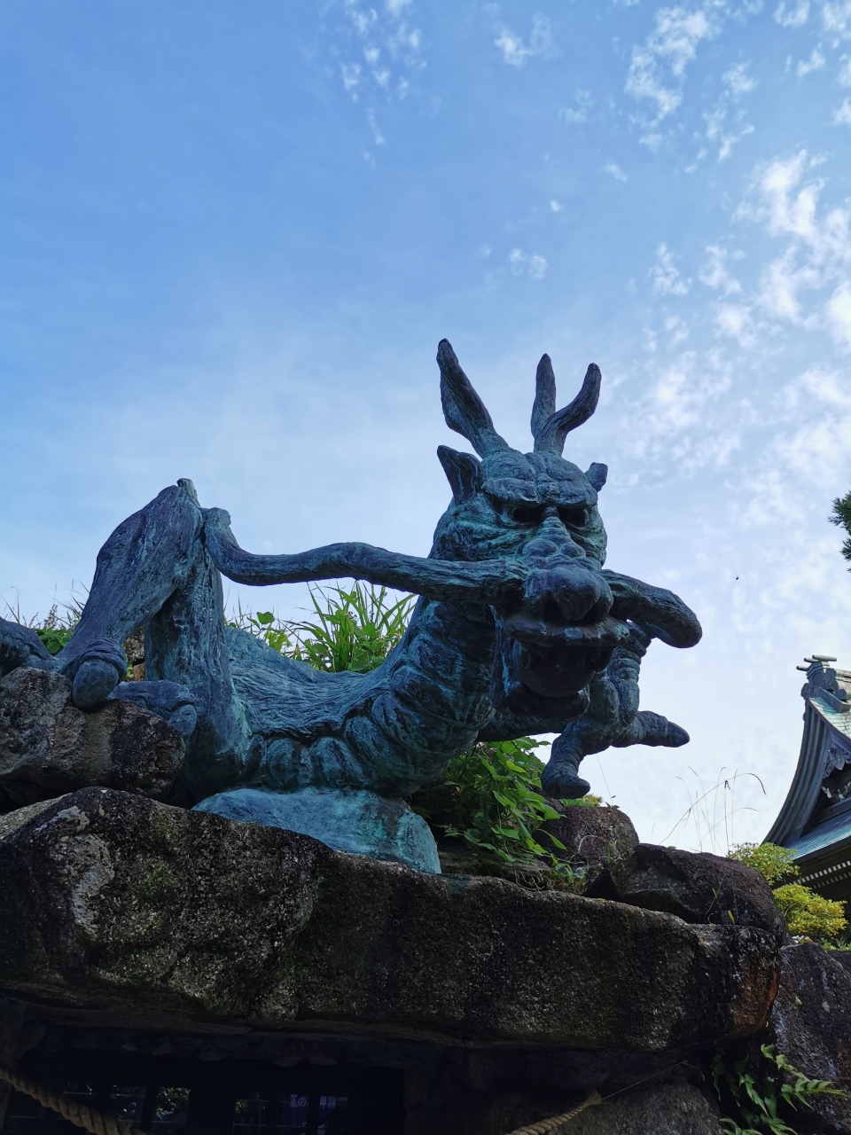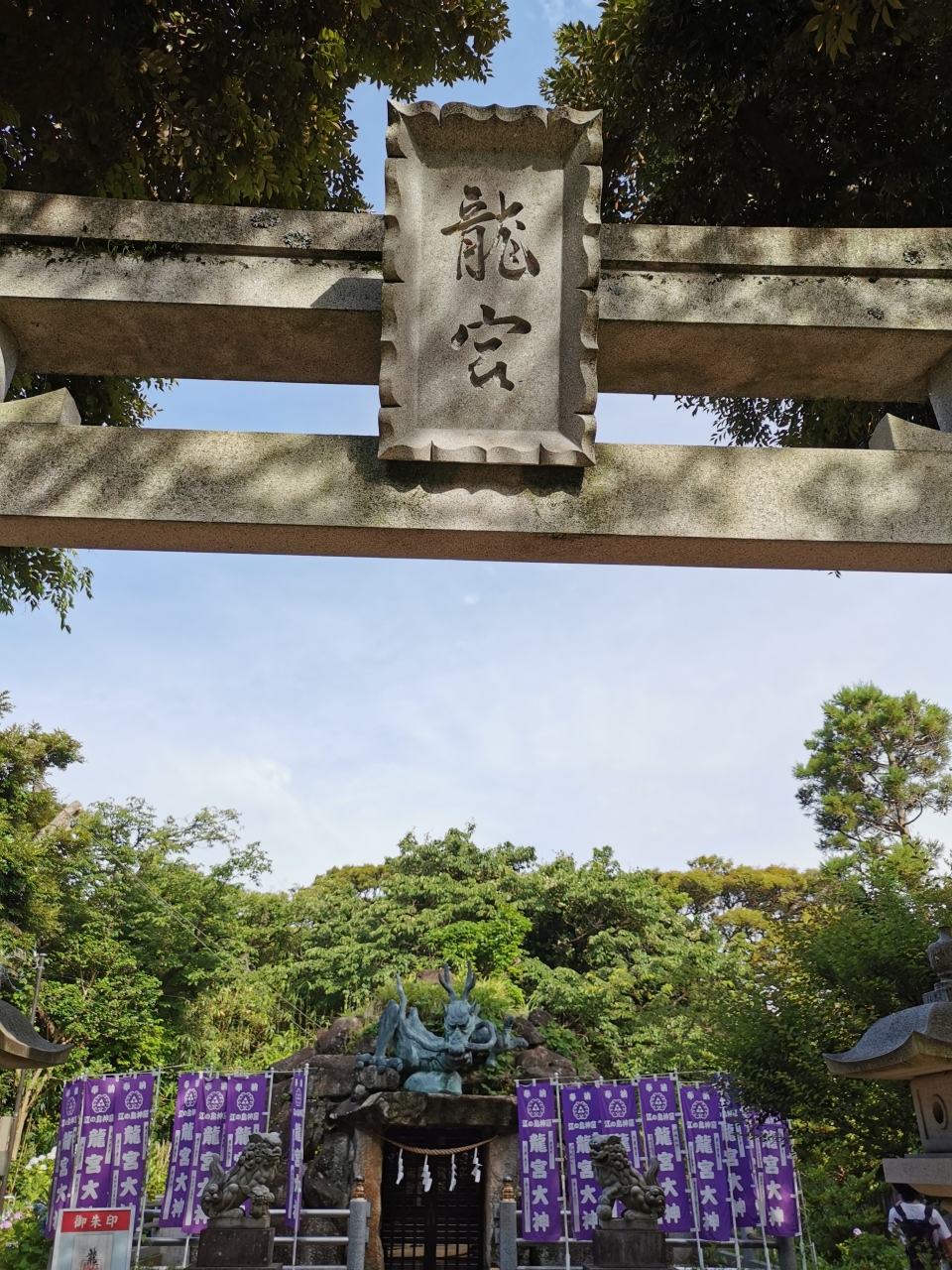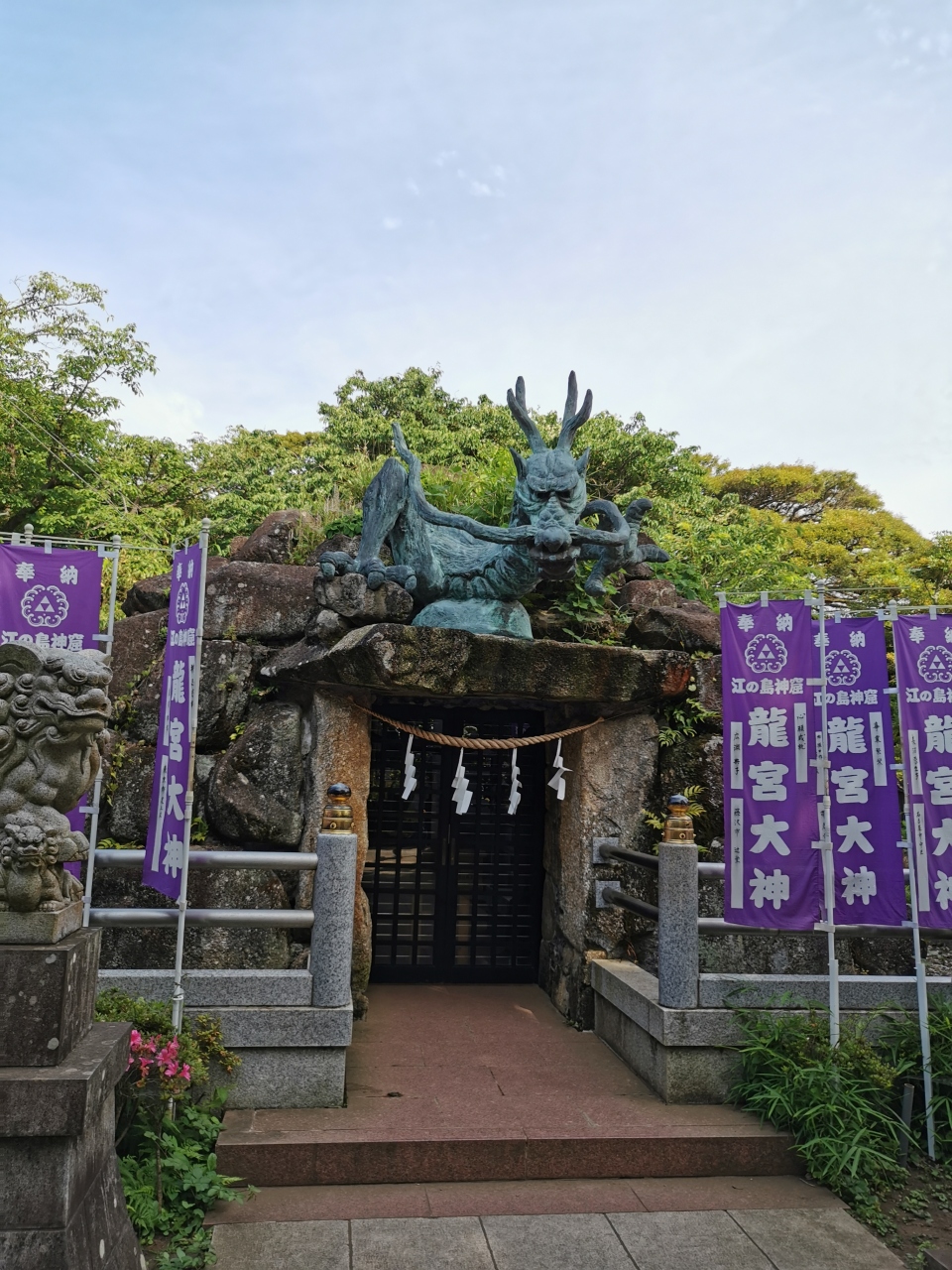 天気の良い日曜日の早朝に江ノ島一周散歩に行きました。有料駐車場に車を停めてから島内を散策です。楼門を抜けて辺津宮、中津宮をされてました。参拝した後、サムエルコッキング苑を通って奥津宮まで色々見ながら1時間弱。江島神社 龍宮は奥津宮の横に位置します。宮の上には龍が。周りに立ち並ぶ紫の幟が良い雰囲気です。あじさいの季節でしたので色合いがマッチして良い感じでした。