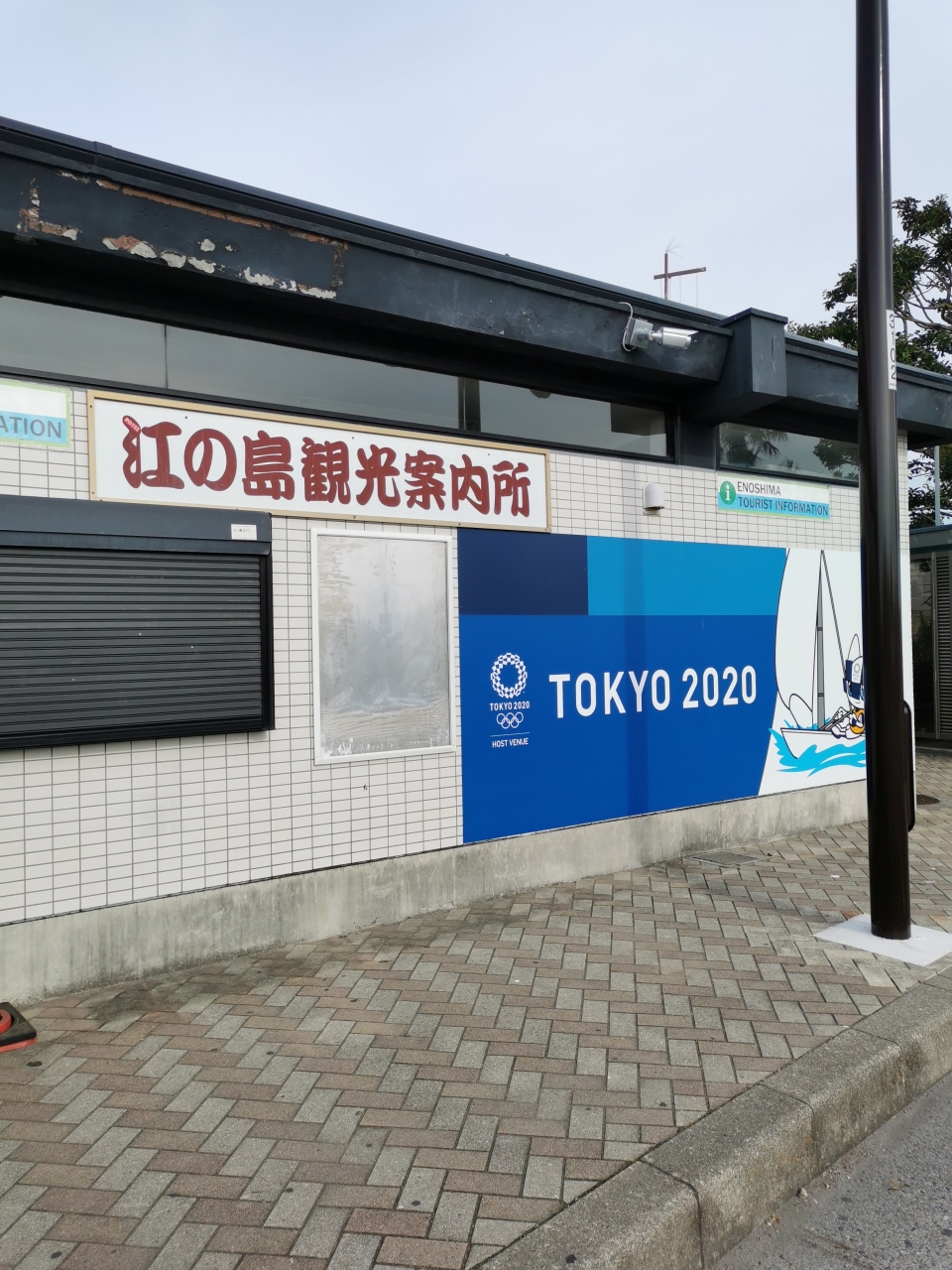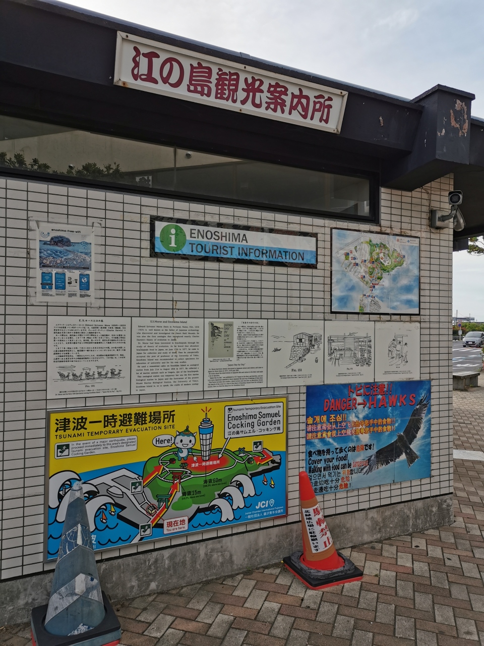 天気の良い日曜日の早朝に江ノ島一周散歩に行きました。有料駐車場に車を停めてから島内を散策です。江の島大橋を渡ってすぐの場所に藤沢市の片瀬江の島観光案内所があります。早朝でしたので営業時間外でした。目の前には海鮮食堂がならび、すぐ弁財天仲見世通りに入れる場所にあって一等地です。