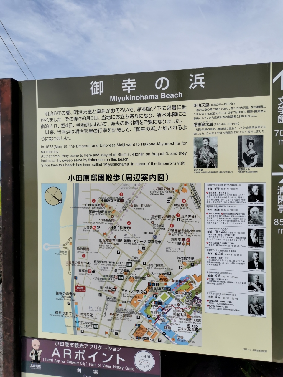 小田原ドライブ&自転車の旅。車に自転車を積んで小田原界隈をサイクリングで観光しました。小田原宿なりわい交流館から湘南海岸の御幸の浜へ。自転車で5~6分程度で到着。明治天皇がお立ち寄りになり、地引き網をご覧になった事を記念してこの様な名前になったとの事です。