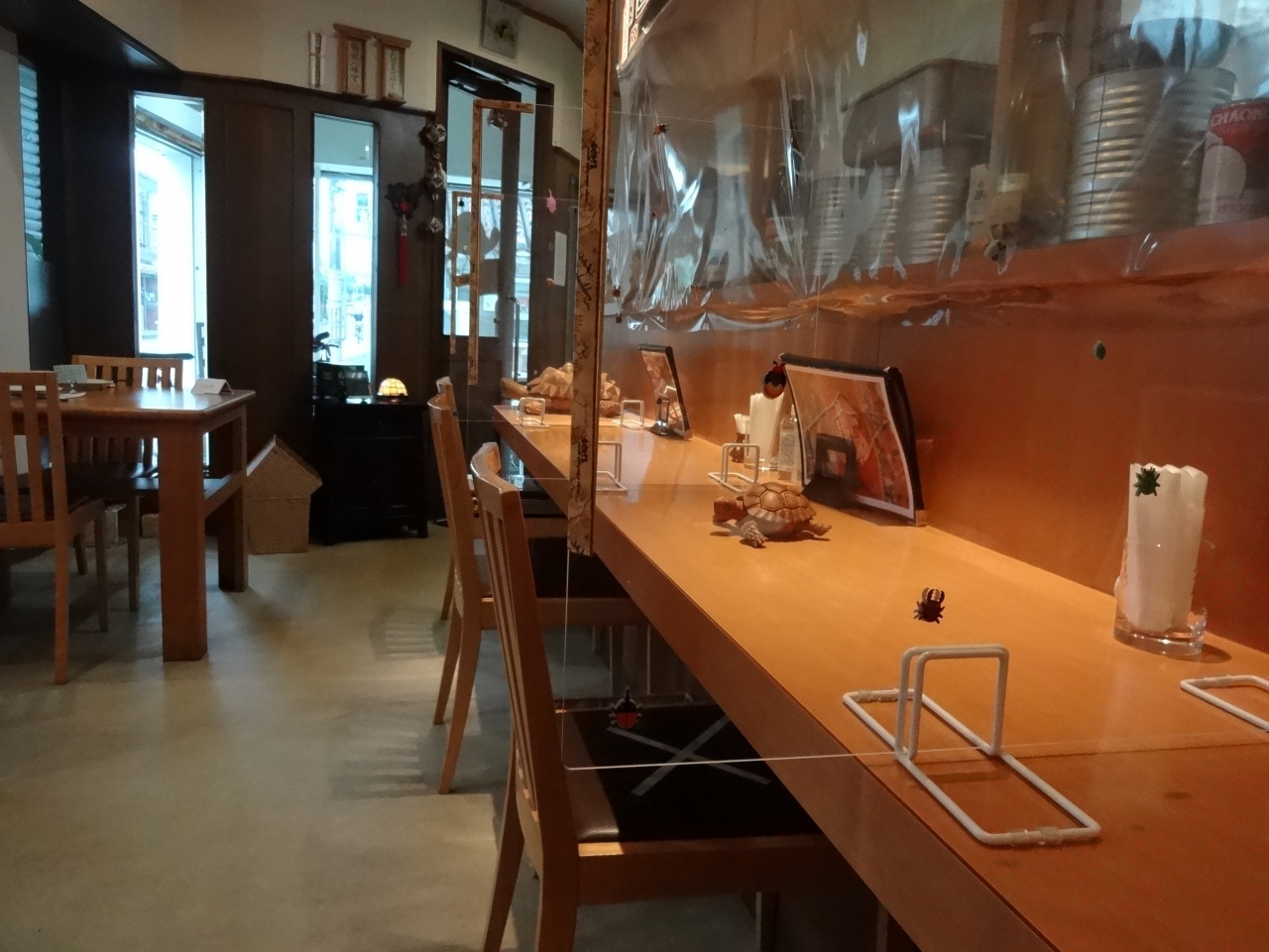 席数は少ないのにソーシャルディスタンスを取れるように工夫されていて、カウンター席でも隣との間隔は意識的に取られている上にアクリル板の設置まである。
