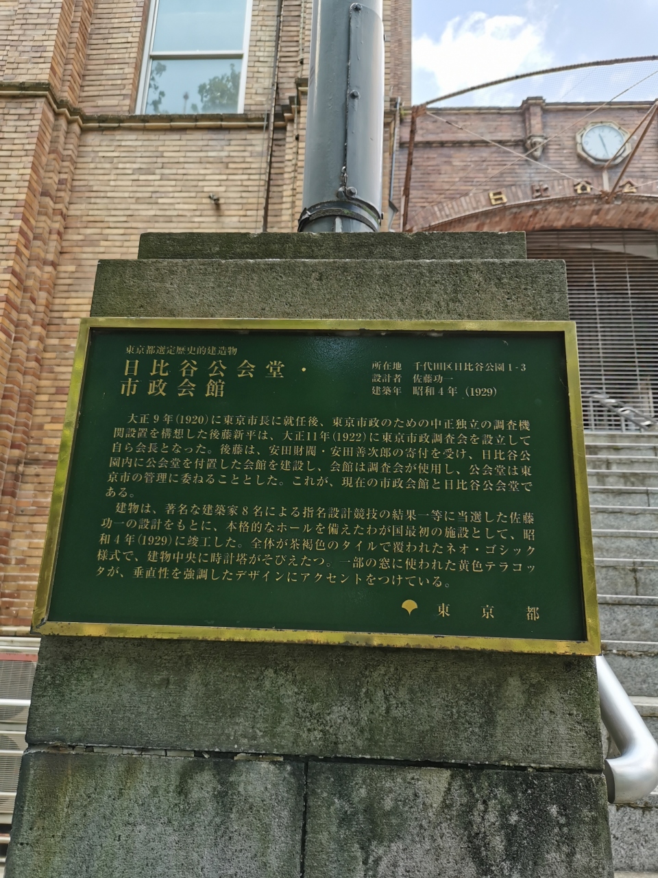 有楽町を出発して日比谷公園を散策。有楽町駅から歩いて10分ほど。東京ミッドタウンから日比谷公園に入りました。色々な噴水あり、オブジェあり、芝生広場あり。日比谷公会堂・市政会館は日比谷公園に隣接。ネオ・ゴシック様式で建築年は昭和4年。ちょっとくたびれていますが立派な建築物です。