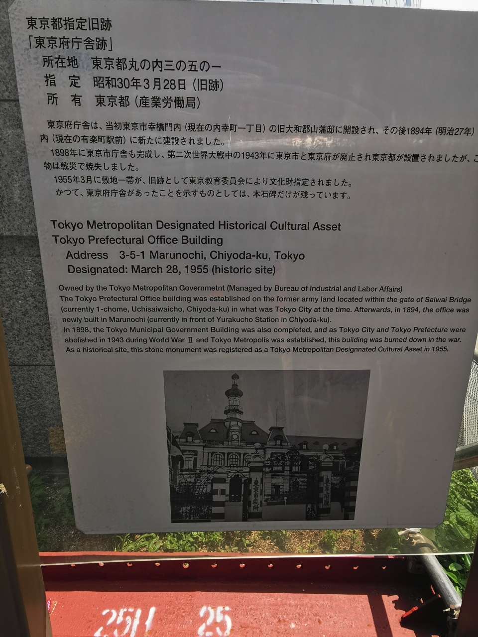 有楽町を出発して日比谷公園を散策。日比谷公園を一回りした後、皇居外苑から有楽町に戻ってきました。東京国際フォーラムは只今工事中。国際フォーラムの東京駅側に「東京府庁舎跡」の石碑と説明看板がありました。元々はここが府庁だったんですね。今は石碑以外はなにもないです。