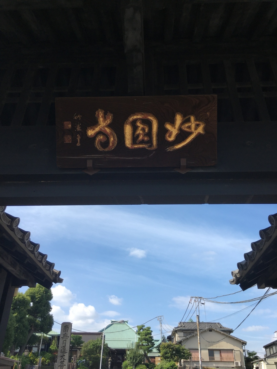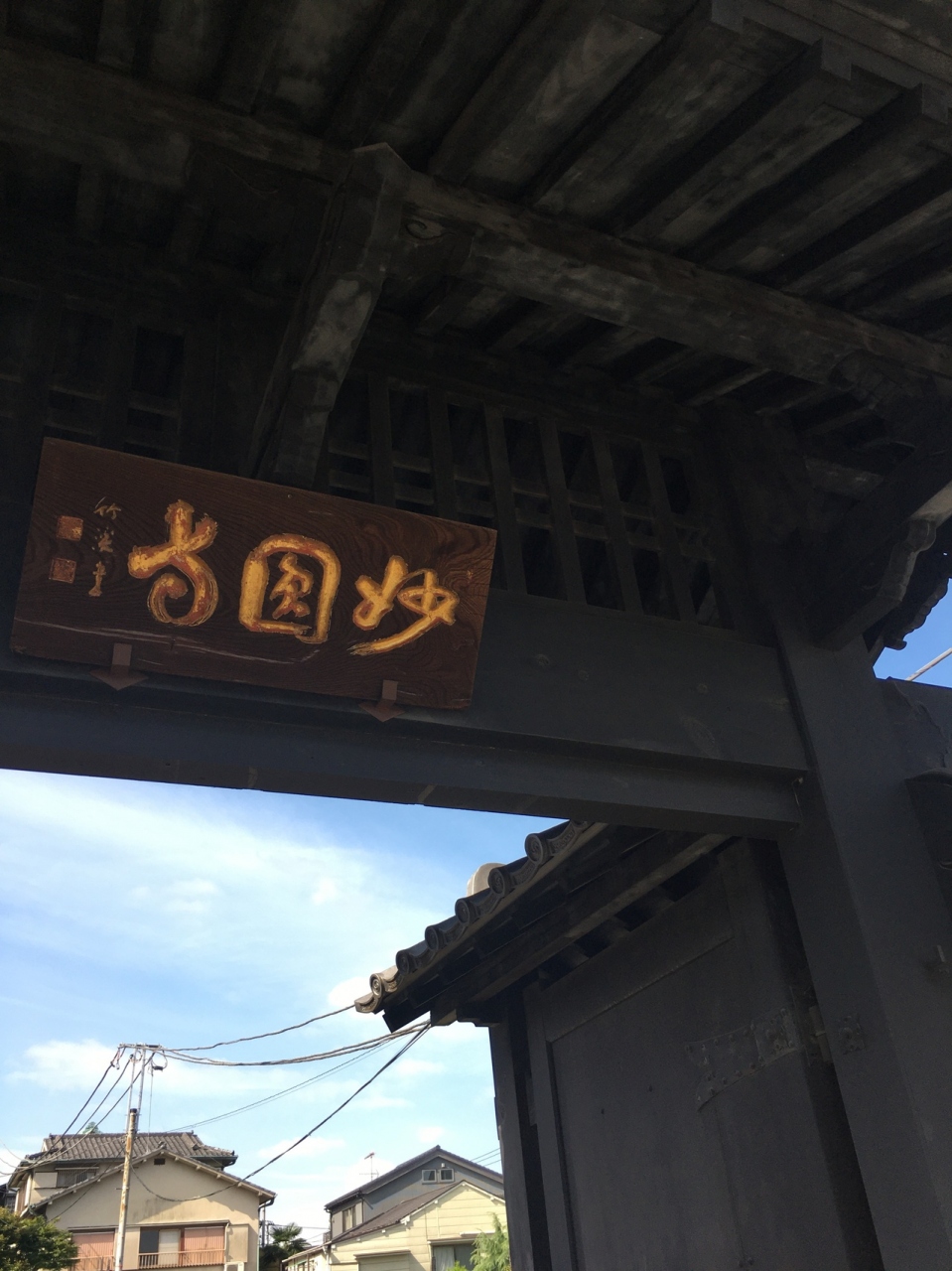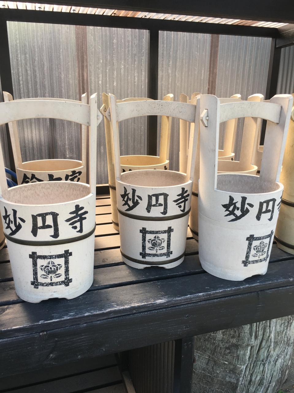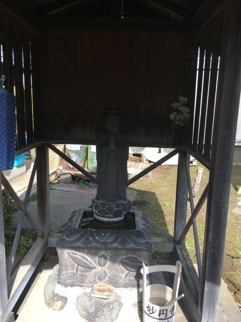 境内に入ると左側には沢山の桶が置いてあり、寺の名前の記載がありました。お墓の横を通り、階段を上がると本堂で、お経が聞こえてきました。小さな祠があり、その横には小さな長身の仏像が安置されていました。隣の妙法寺と繋がっていました。