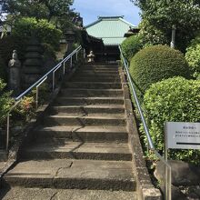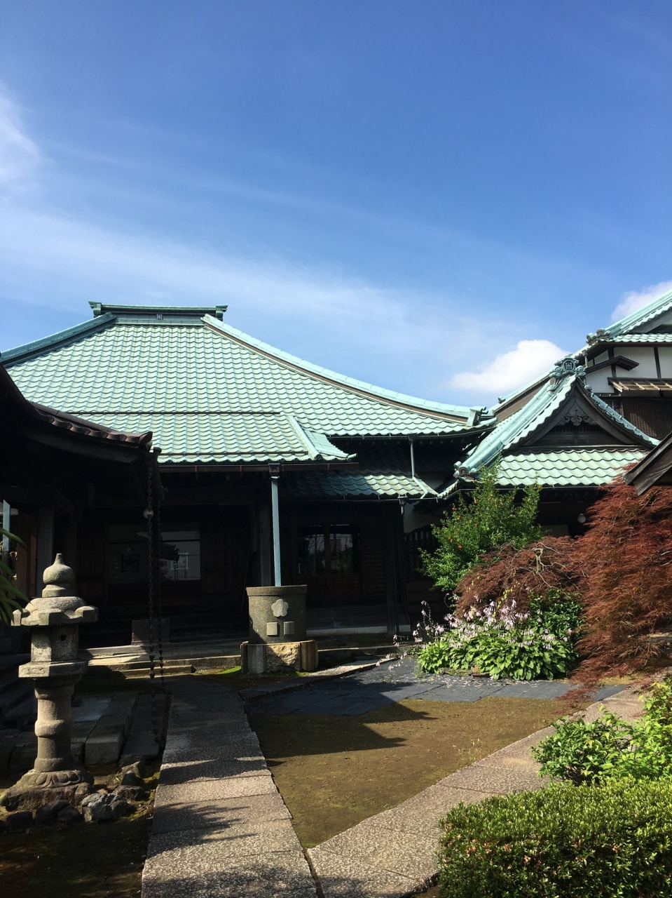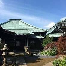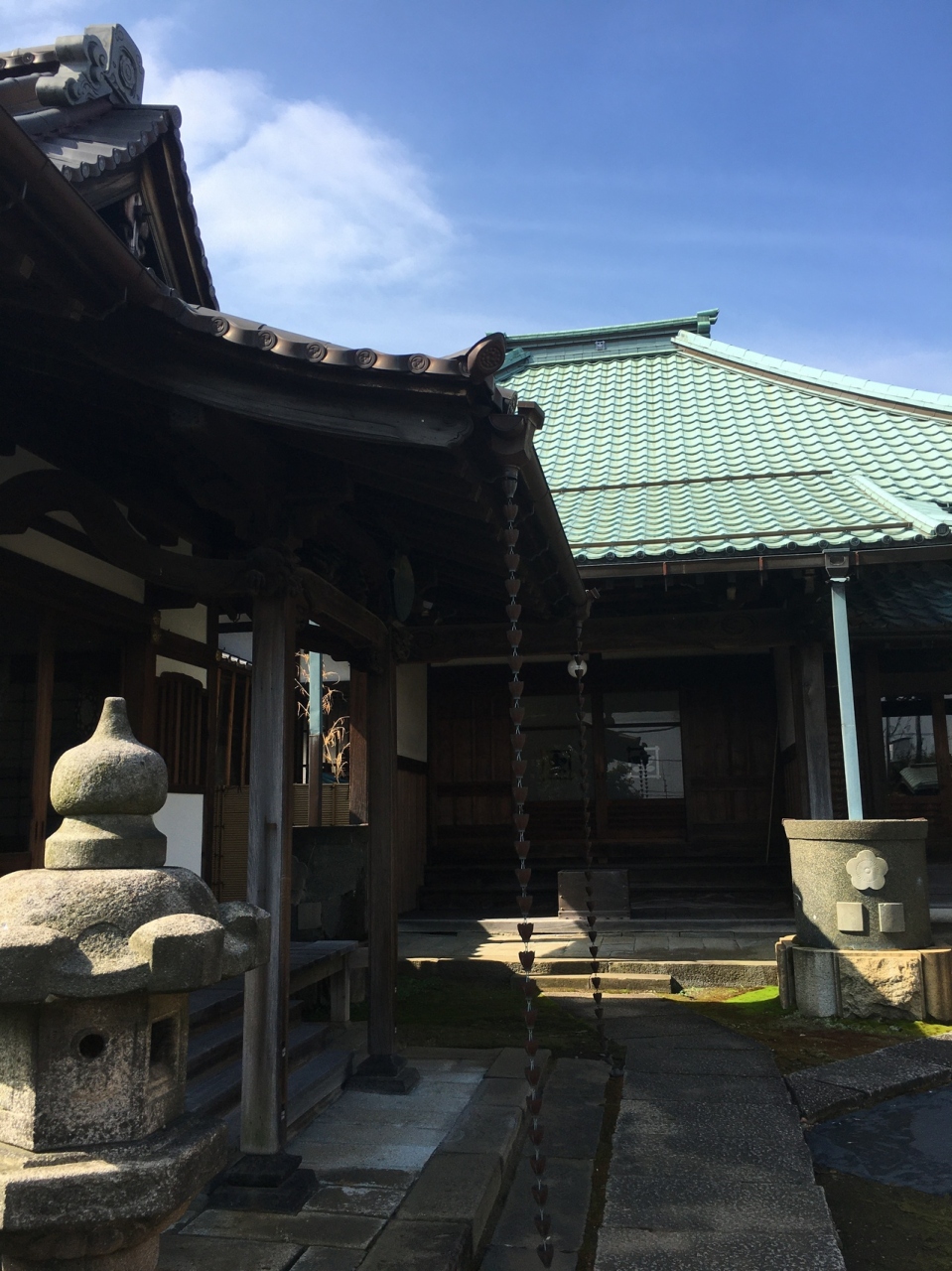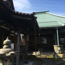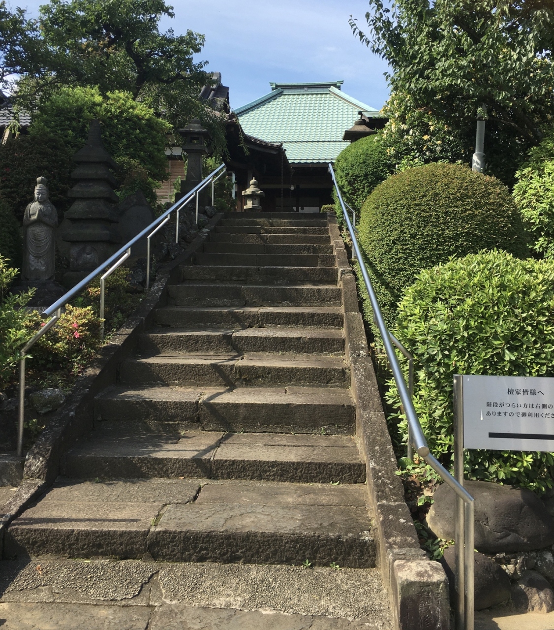 境内に入ると左側には沢山の桶が置いてあり、寺の名前の記載がありました。お墓の横を通り、階段を上がると本堂で、お経が聞こえてきました。小さな祠があり、その横には小さな長身の仏像が安置されていました。隣の妙法寺と繋がっていました。