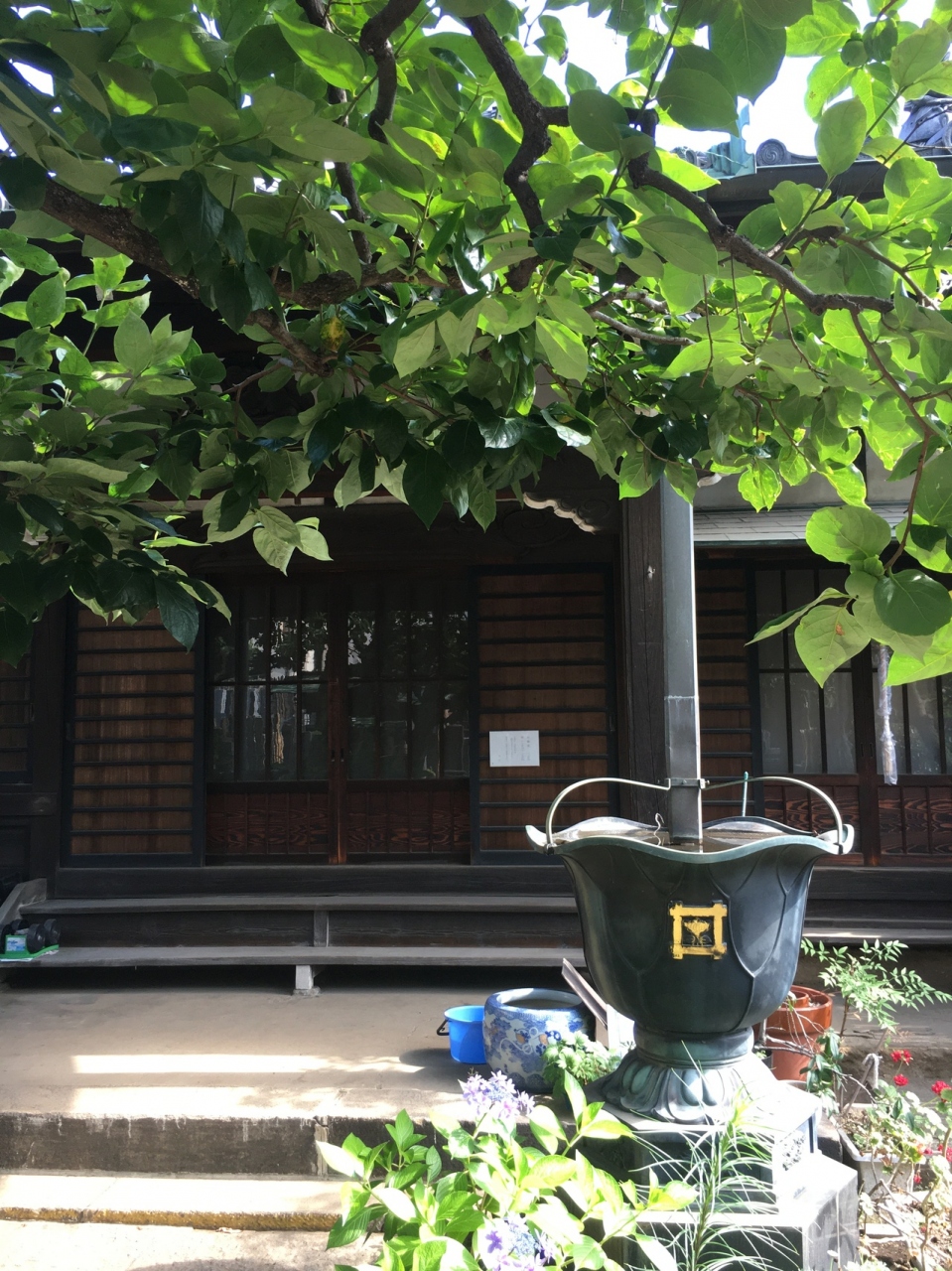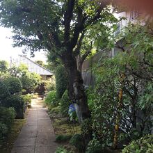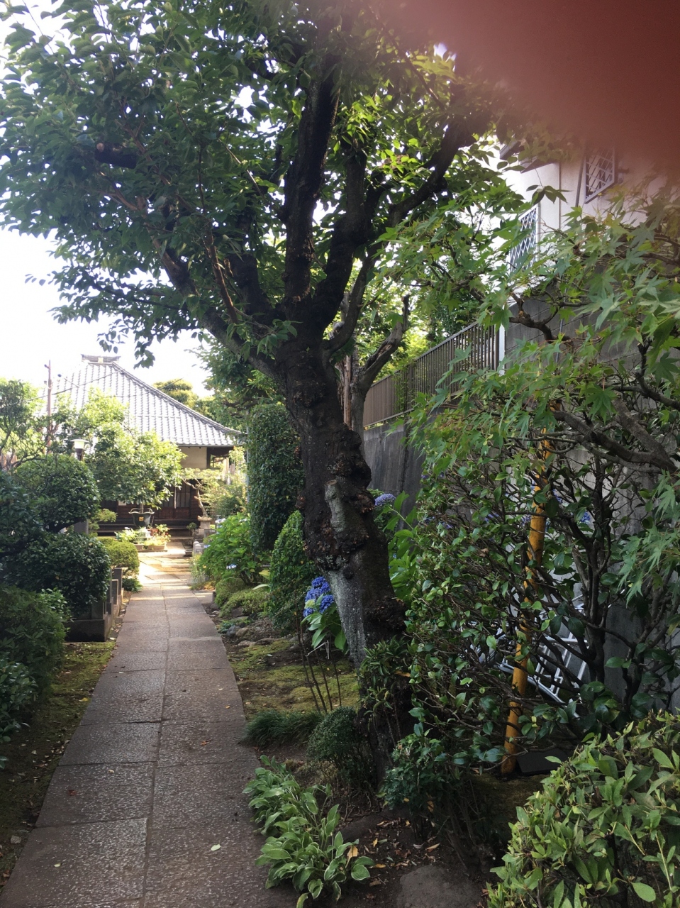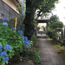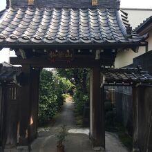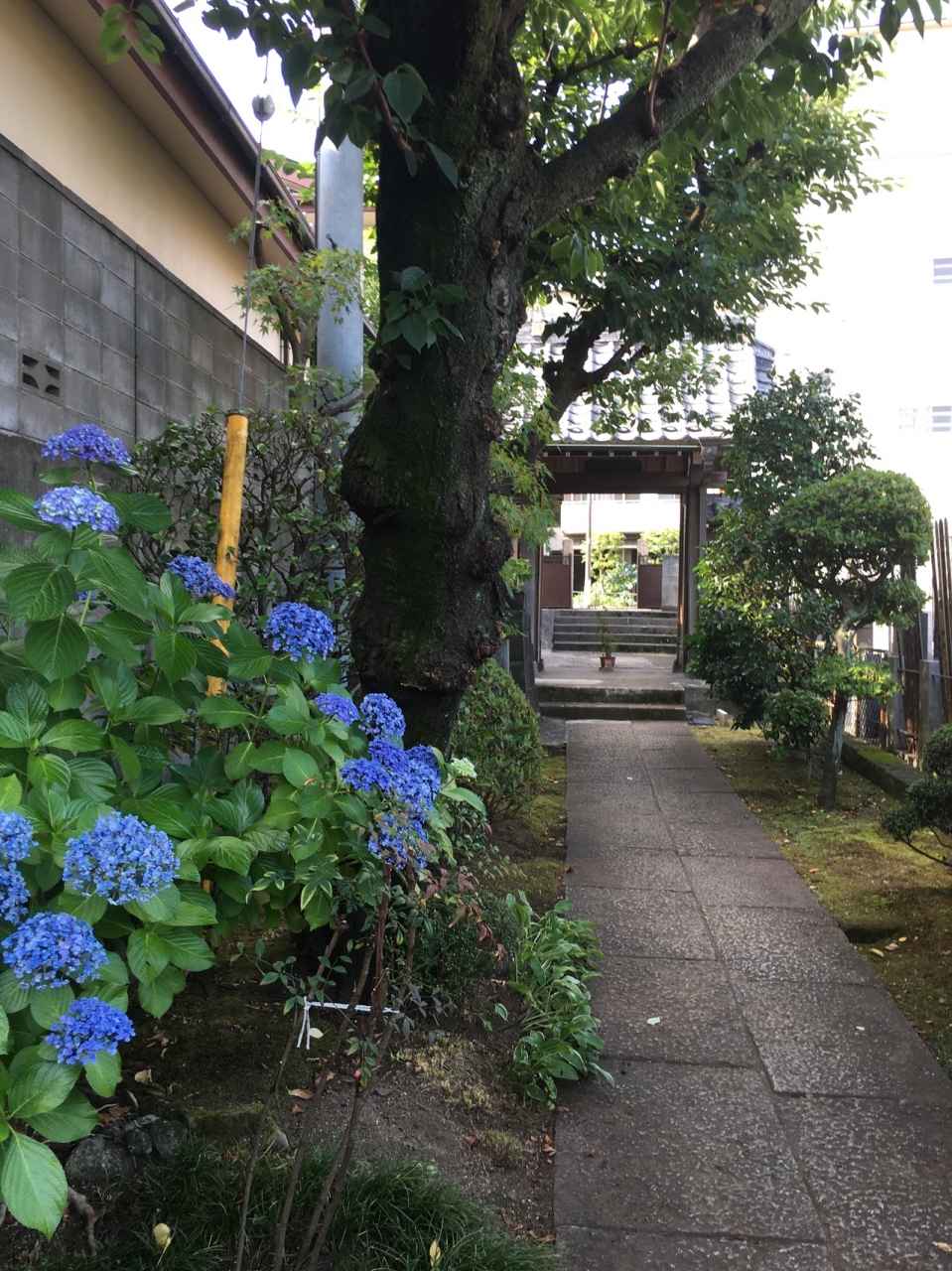 出入口が横の建物に挟まれている感じでしたが山門は良い雰囲気を醸し出し、あじさいの花が綺麗に咲いていました。本堂までは細い小道を通り左側にはお墓がありました。木々が植わり枝が伸びている木が多かったです。古い本堂でした。