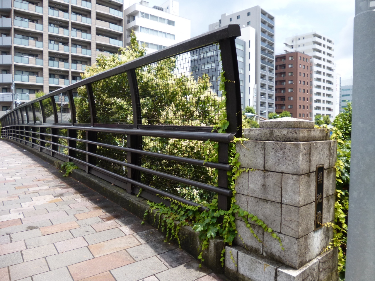 平成通りが首都高速道路と交差する部分に架かる橋が「築地橋」です。築地大橋という橋もありますが、こちらは隅田川の最下流に架かる橋です。さほど特徴のない橋ですが、6月初旬は橋の周りに緑が多く、色鮮やかで力強い姿が印象的でした。