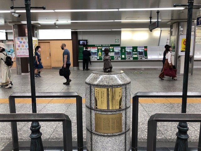 JR横浜駅の中央通路(東口と南口をつないでいる、駅のメイン通路)の真ん中に、「赤い靴はいてた女の子」の像があります。約1mの高さの台座に、30cmほどの像がのっています。横浜駅の待ち合わせ場所としてよく使われていて、周辺には、いつも待ち合わせの人でいっぱいです。