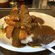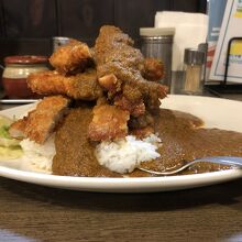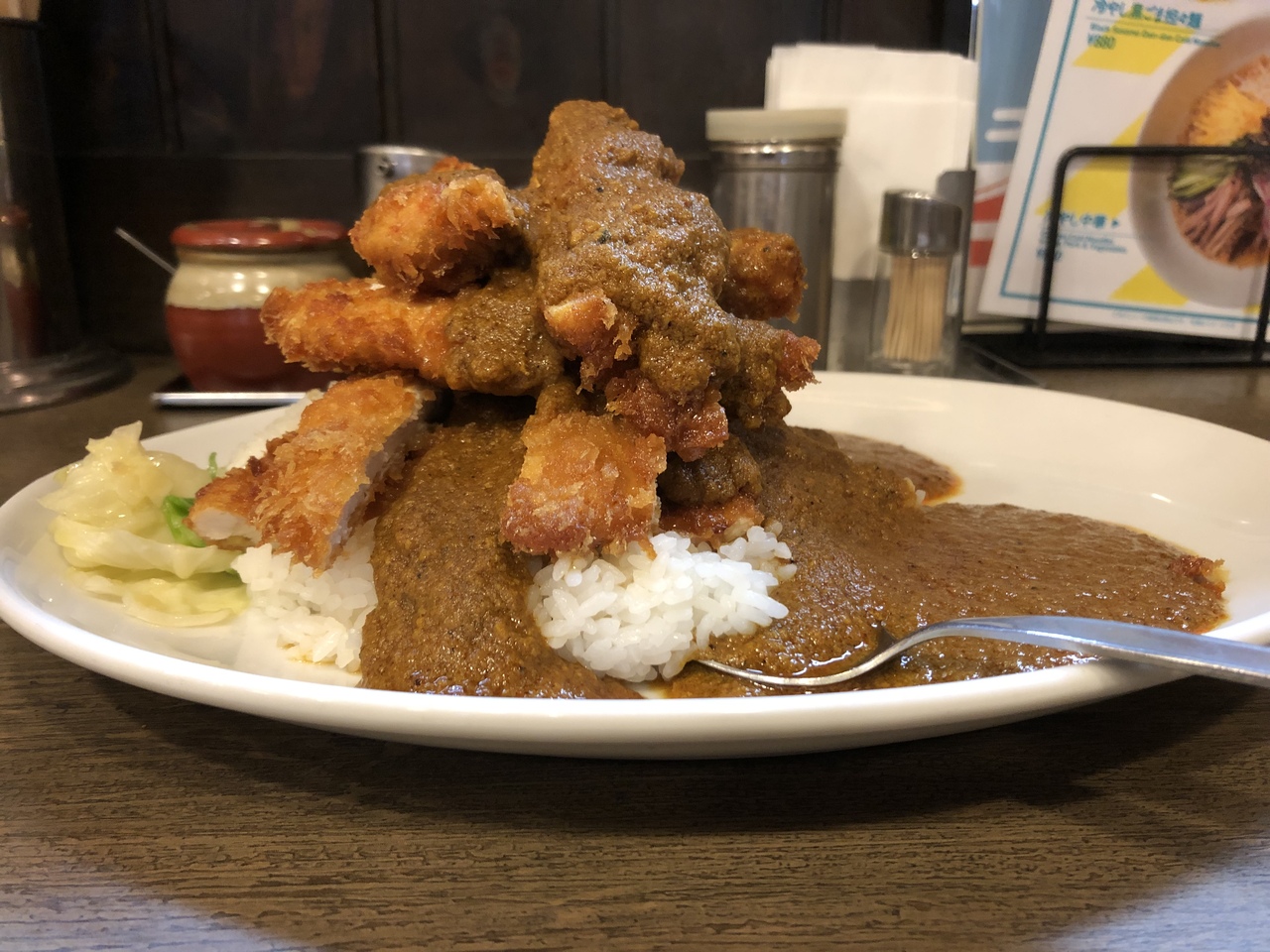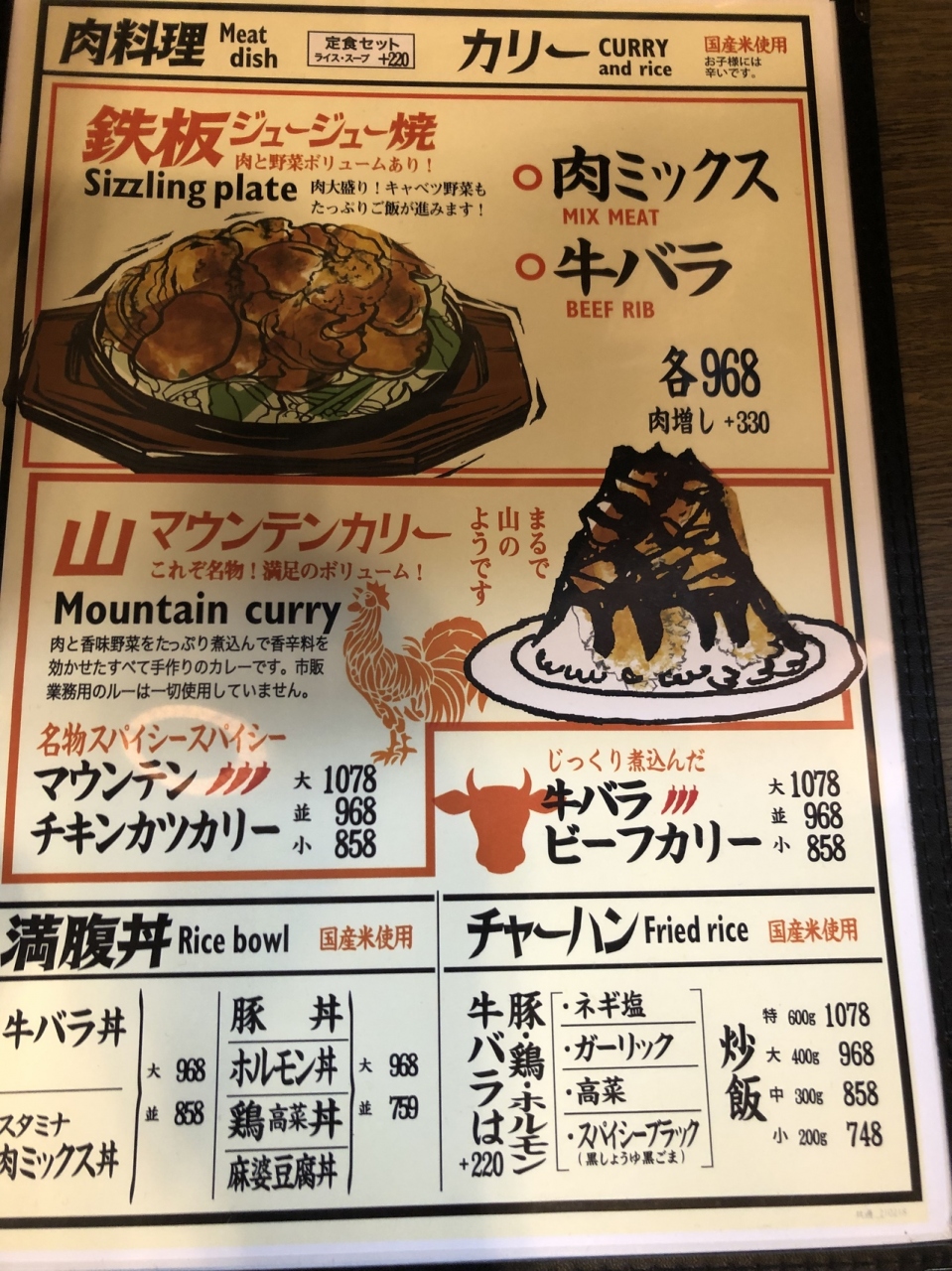片山交差点からすぐ、産業道路沿いにある定食店。餃子、つまみ、中華料理、坦々麺やラーメンとなんでも揃うお店ですが、名物は「マウンテンカリー」。メニューにはイメージの絵が描かれているのですが凄さを感じる。お店の方いわく、並盛りで大盛りレベルとのことで並盛りを注文(大盛りはご飯が+100gで、チキンカツが一回り大きくなるとのこと)。数分後、到着したマウンテンカリーは、そのビジュアルに驚く。カレーは、スパイスがかなり効いていて後から辛さがかなりある。肉と香味野菜をたっぷり煮込んでスパイスを効かせた手作りルーのカレーで、本格的なインドカレー店で出されるようなカレー。思った以上に本格的なインドカレー。業務用のルーは使っていないとのことだが、家庭ではなかぬか食べられない味。しかも山盛りのチキンカツはインパクト大。カツにはルーがちょうどよいあんばいにかけられている。カツは少し冷めていて、ジューシーさはあまりないが、カレーと合わせるから許せるかな。辛さが後に残るので、卵スープがありがたい。大盛りにしなくて良かった。