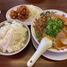 ラーメンの他に唐揚げ定食(唐揚げ4ケ、ごはん)250円(税抜き)を注文しました。唐揚げは割と大振りで、注文が入ってから揚げてます。ご飯の大盛りは無料。これで250円ですので、かなりお得です。唐揚げはちょうど良い硬さ、皮の付き方で美味しかったです。