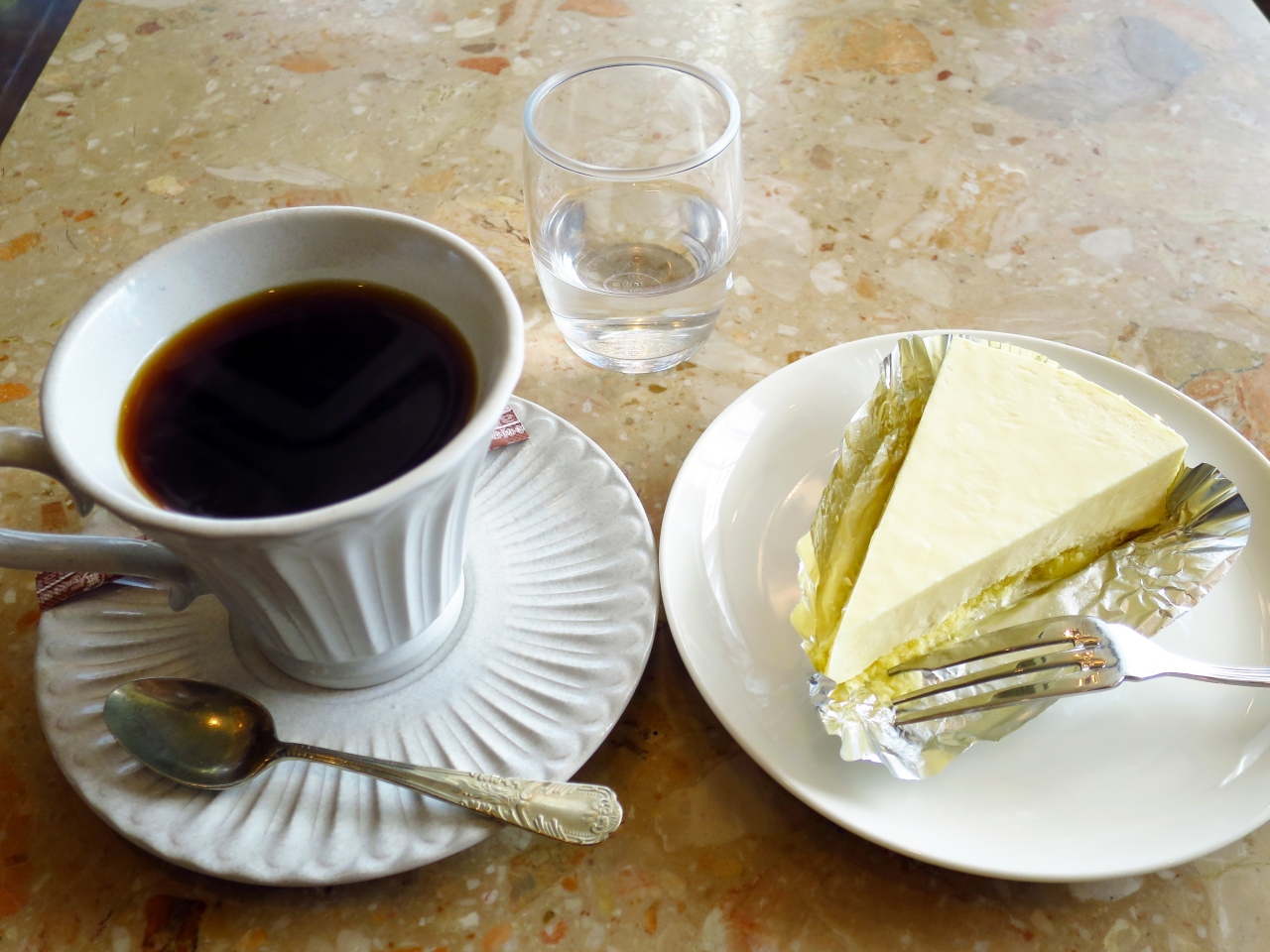 ケーキは出来合いのものですが、コーヒーは自家焙煎のものが給仕されます。香り・味は少し薄目でやや物足りないかもしれませんが、薄暗く店外の喧騒の音もほとんど遮断されているところを見ると、ホッと一息つくには丁度いいかもしれません。