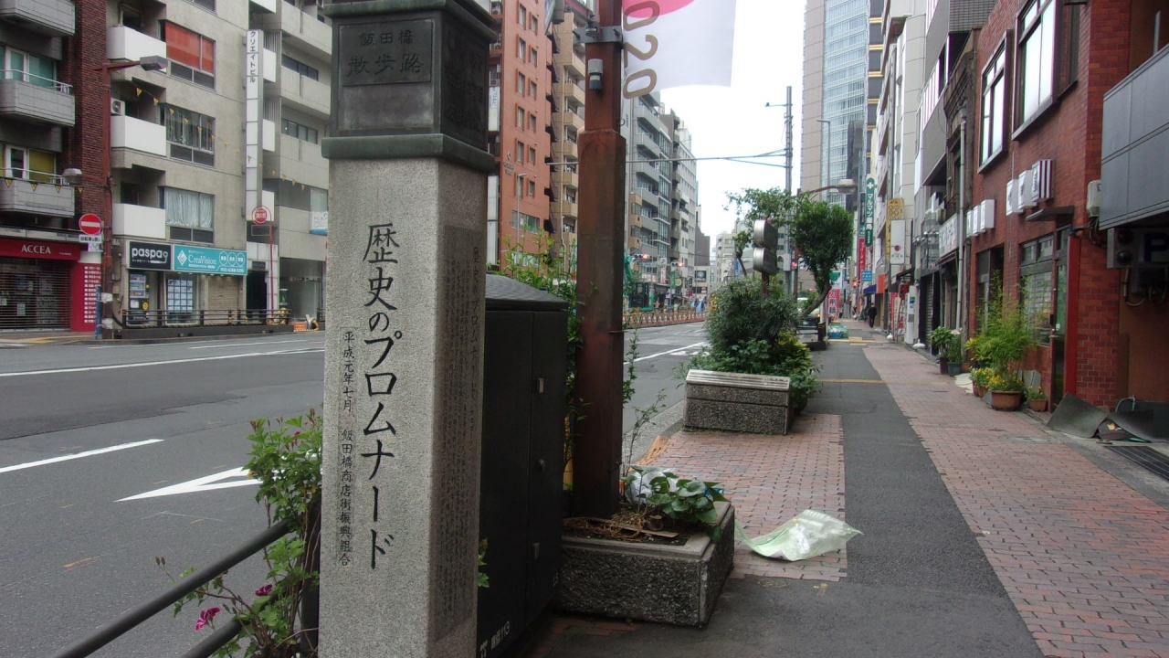 地元の飯田橋商店街振興会が、目白通りを飯田橋の散歩路にすべく、飯田橋駅から九段下駅にかけての両側歩道に石の標柱13本を建て、この町の移りかわりを示している。その経緯を説明する石柱がこの「歴史のプロムナード 」。