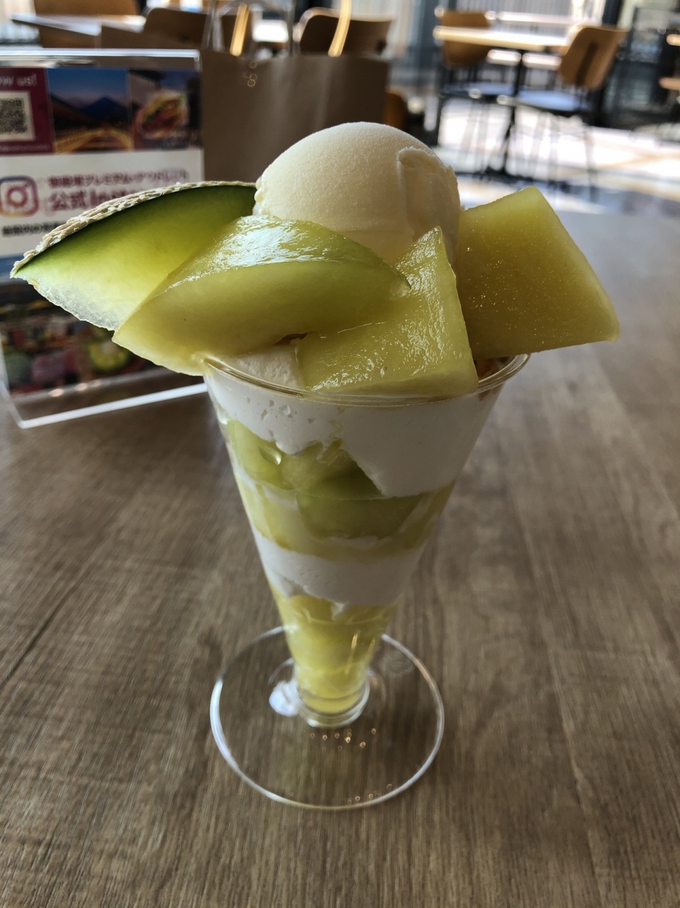 エレベーター側はフルーツショップになっていて、贈答用の高級フルーツが並んでいますが、実はフルーツパフェは意外とリーズナブル。サイズも小ぶりですが、アウトレットで一息つくにはちょうどよい量だと思います。果物はさすがのお味。