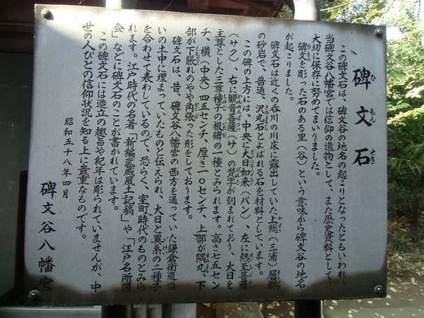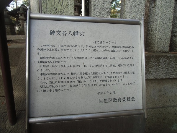本殿右手には、碑文谷の名の由来となった碑文石が展示されており、説明板もあるので郷土史の勉強になりました。