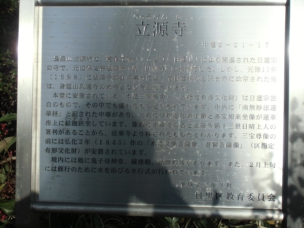 説明板によると、寛永元年(1624)碑文谷法華寺住僧、遠聲院日運の開基。